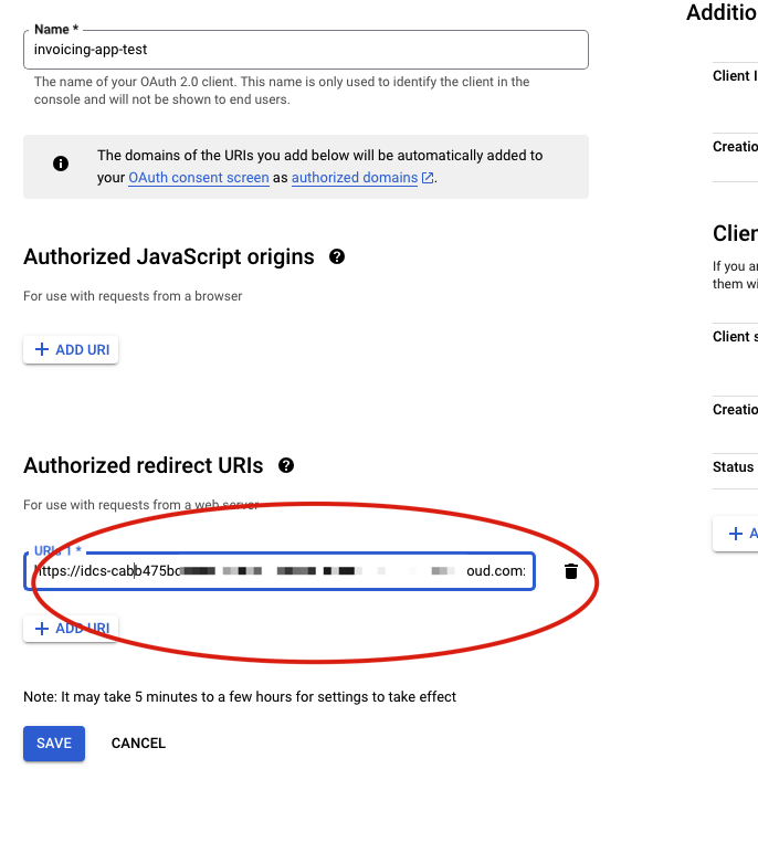 Additio Name * invoicing-app-test The name ofyour OAuth 2.0 client. This name is only used to identify the client in the Client console and will not be shown to end users. Creatio The domains of the URIs you add below will be automatically added to your OAuth consent screen as authorized domains Z. Clier If you ar them Wi Client - Authorized JavaScript origins R. For use with requests from a browser + ADD URI Creatio Authorized redirect URIs 0 For use with requests from a weba ar Status UR ltps/idcs-cabb475ba oud.com: + ADDA URI Note: It may take 5 minutes to a few hours for settings to take effect SAVE CANCEL
