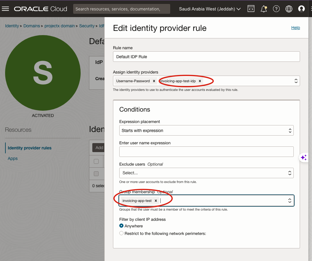 ORACLE Cloud Search resources, services, documentation, Saudi Arabia West Jeddah) V Identity> Domains > projectx domain> Security: > IdF Edit identity provider rule Help Defa Rule name Default IDP Rule IdP - Assign identity providers Crea Username-Password x (nvoicing-app-test-idp X C The identity providers to use to authenticate the user accounts evaluated by this rule. Conditions Expression placement Starts with expression Enter user name expression ACTIVATED Resources Iden C Identity provider rules Apps Add Exclude users Optional Select... C One or more user accounts to exclude from this rule. Croup membership Uptional invoicing-app-test X selec C Groups that the user must be a member of to meet the criteria of this rule. Filter by client IP address Anywhere Restrict to the following network perimeters: