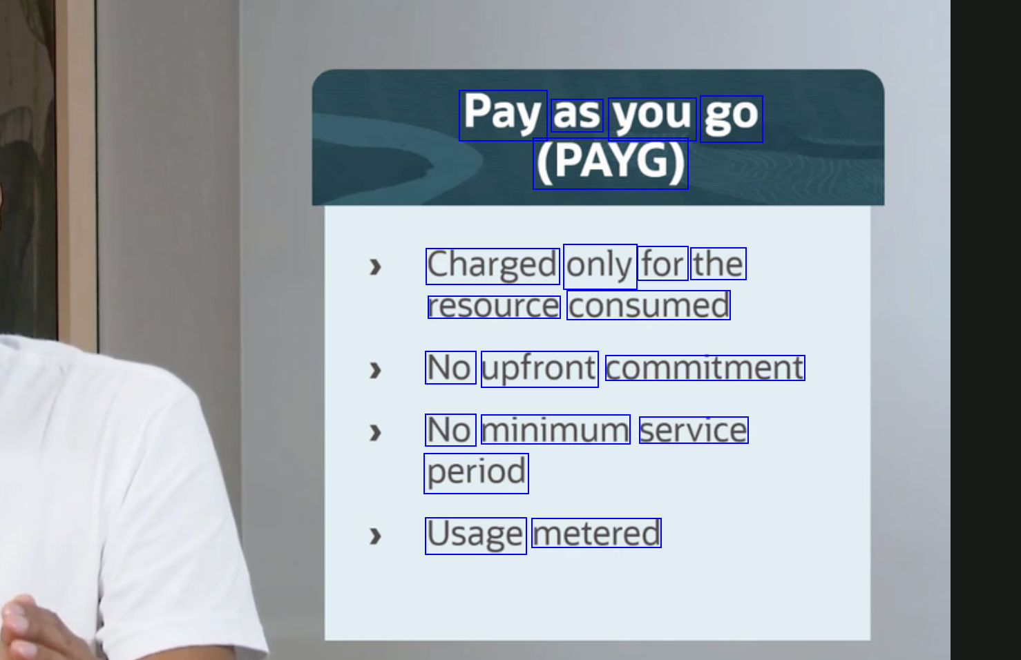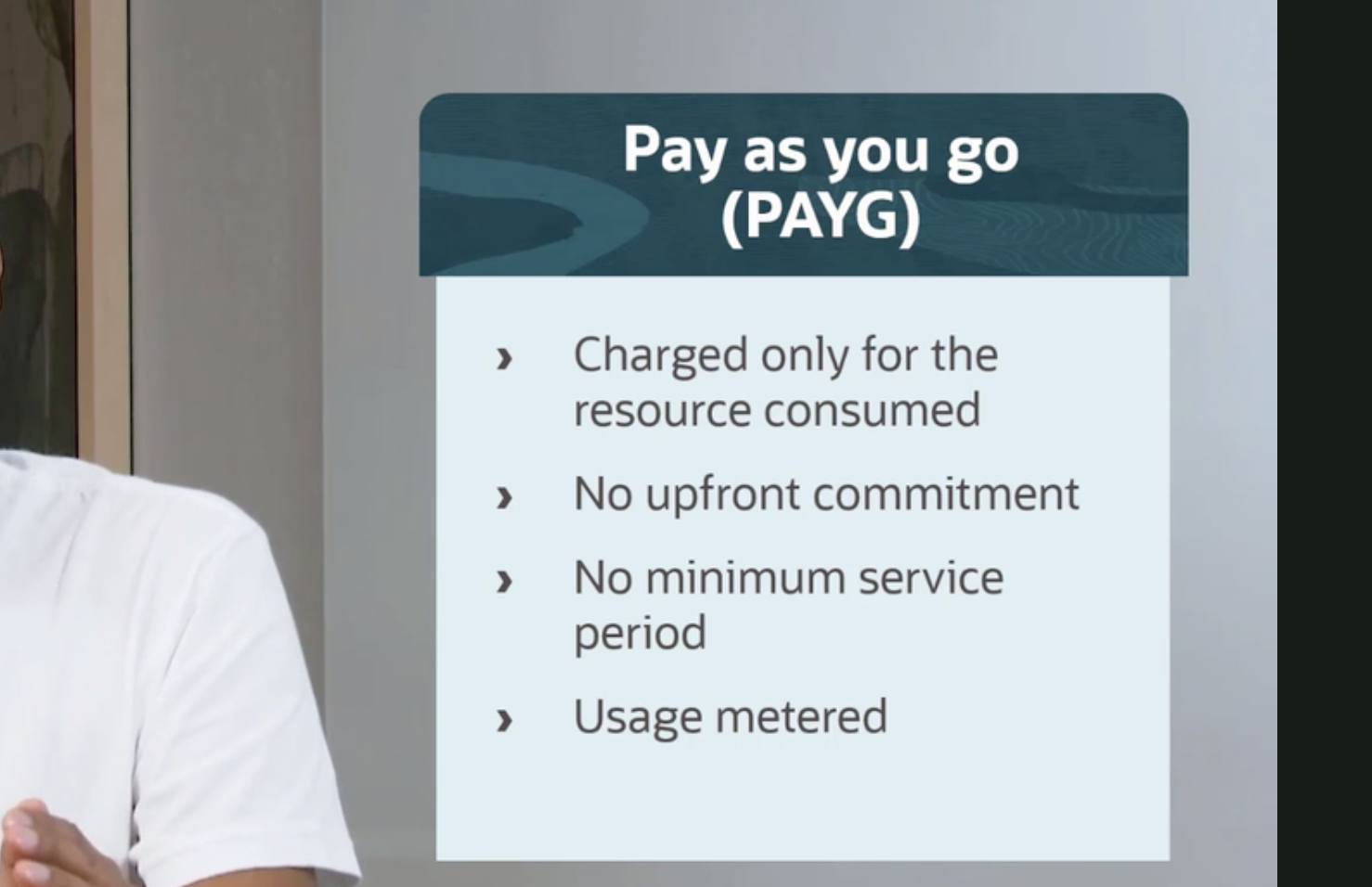 Pay as you go (PAYG) Charged only for the resource consumed No upfront commitment No minimum service period Usage metered