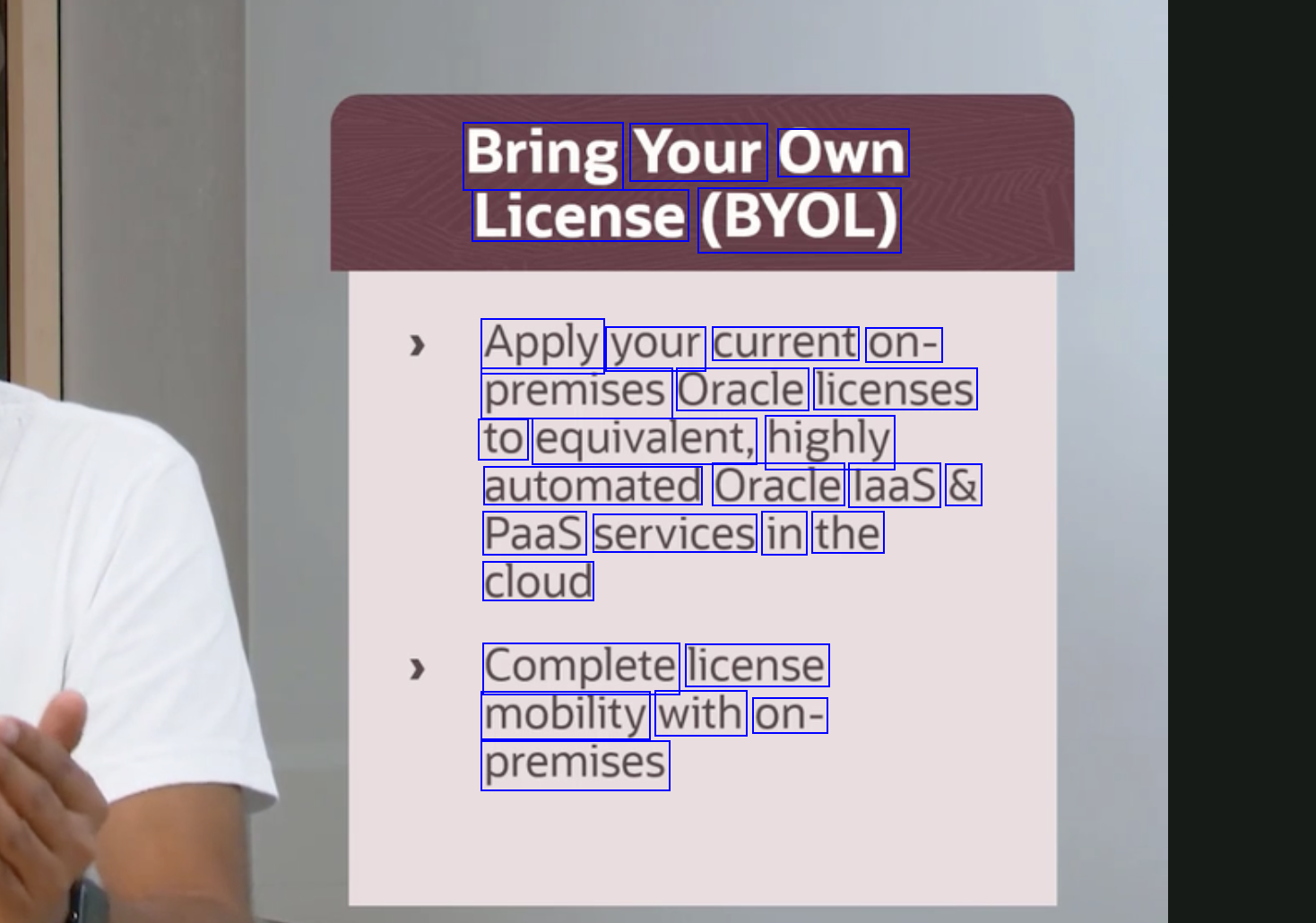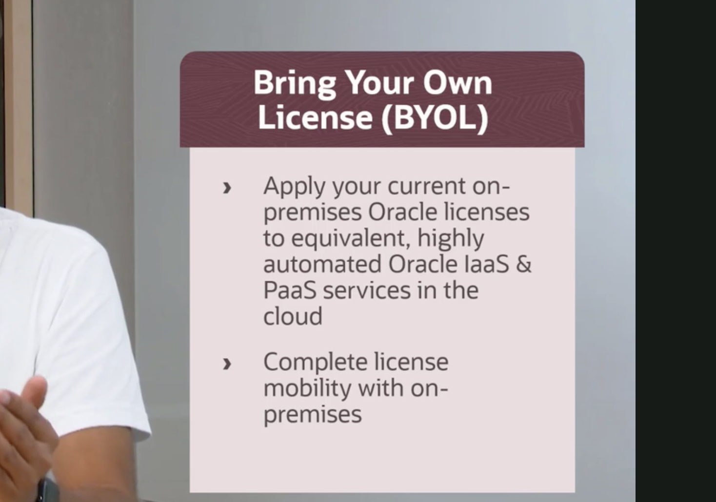 Bring Your Own License (BYOL) Apply your current on- premises Oracle licenses to equivalent, highly automated Oracle laas & Paas services in the cloud Complete license mobility with on- premises