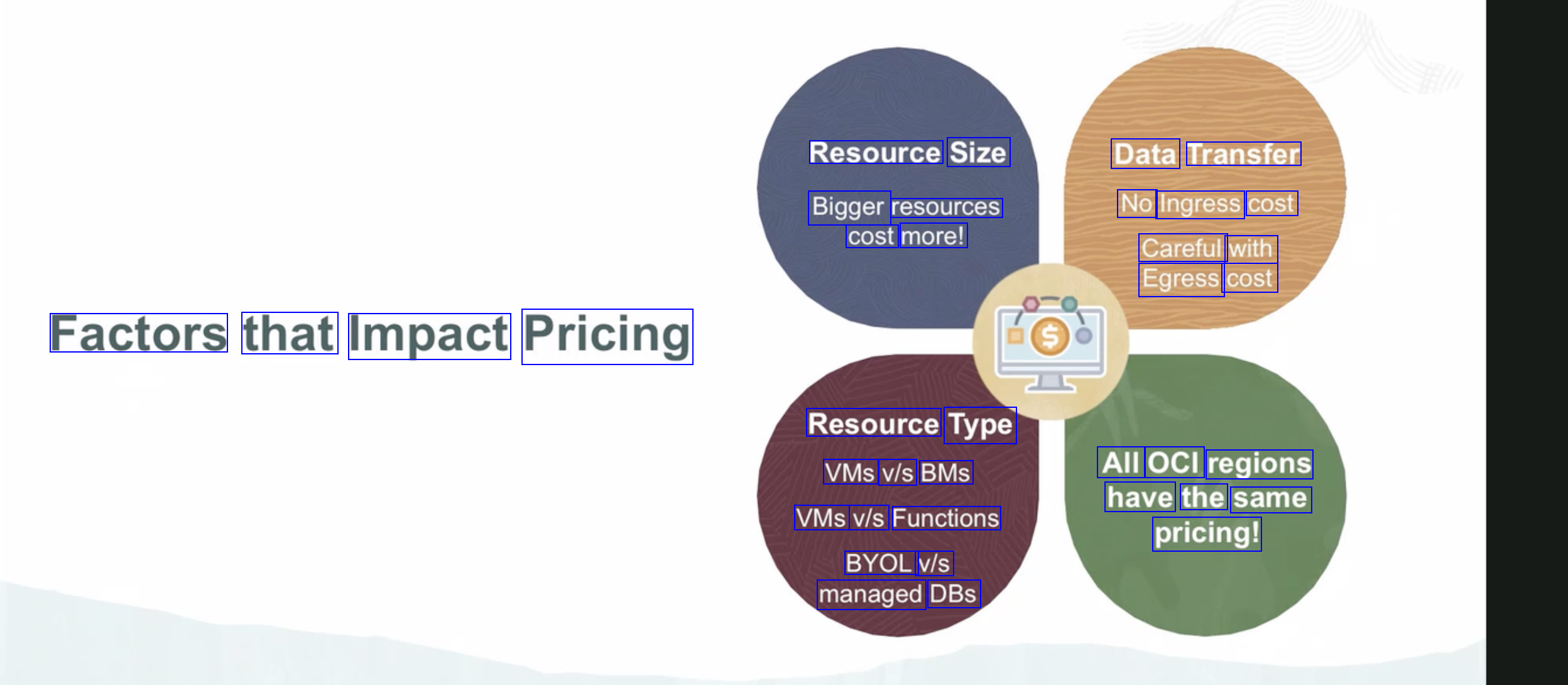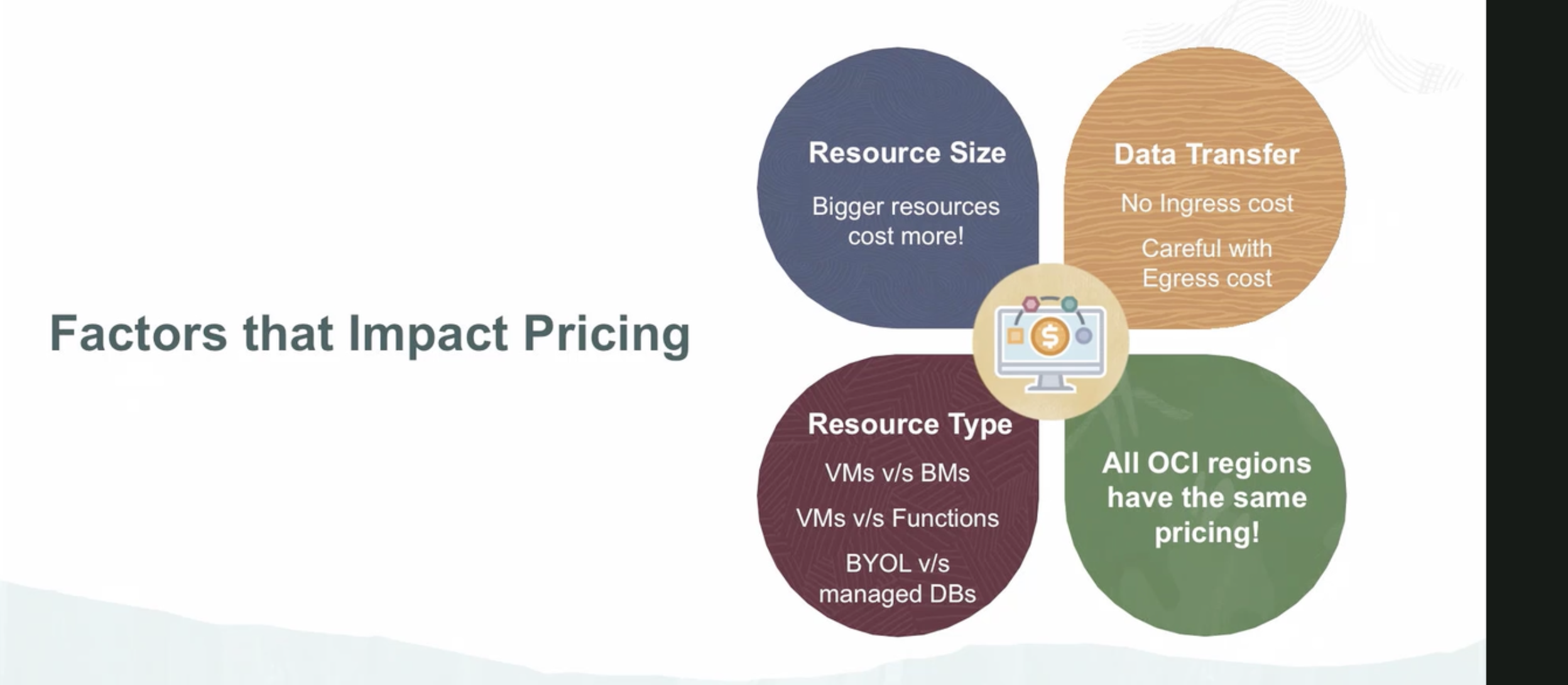 Resource Size Data Transfer Bigger resources cost more! No Ingress cost Careful with Egress cost Factors that Impact Pricing Resource Type VMs v/s BMs All OCI regions have the same pricing! VMs v/s Functions BYOL v/s managed DBs