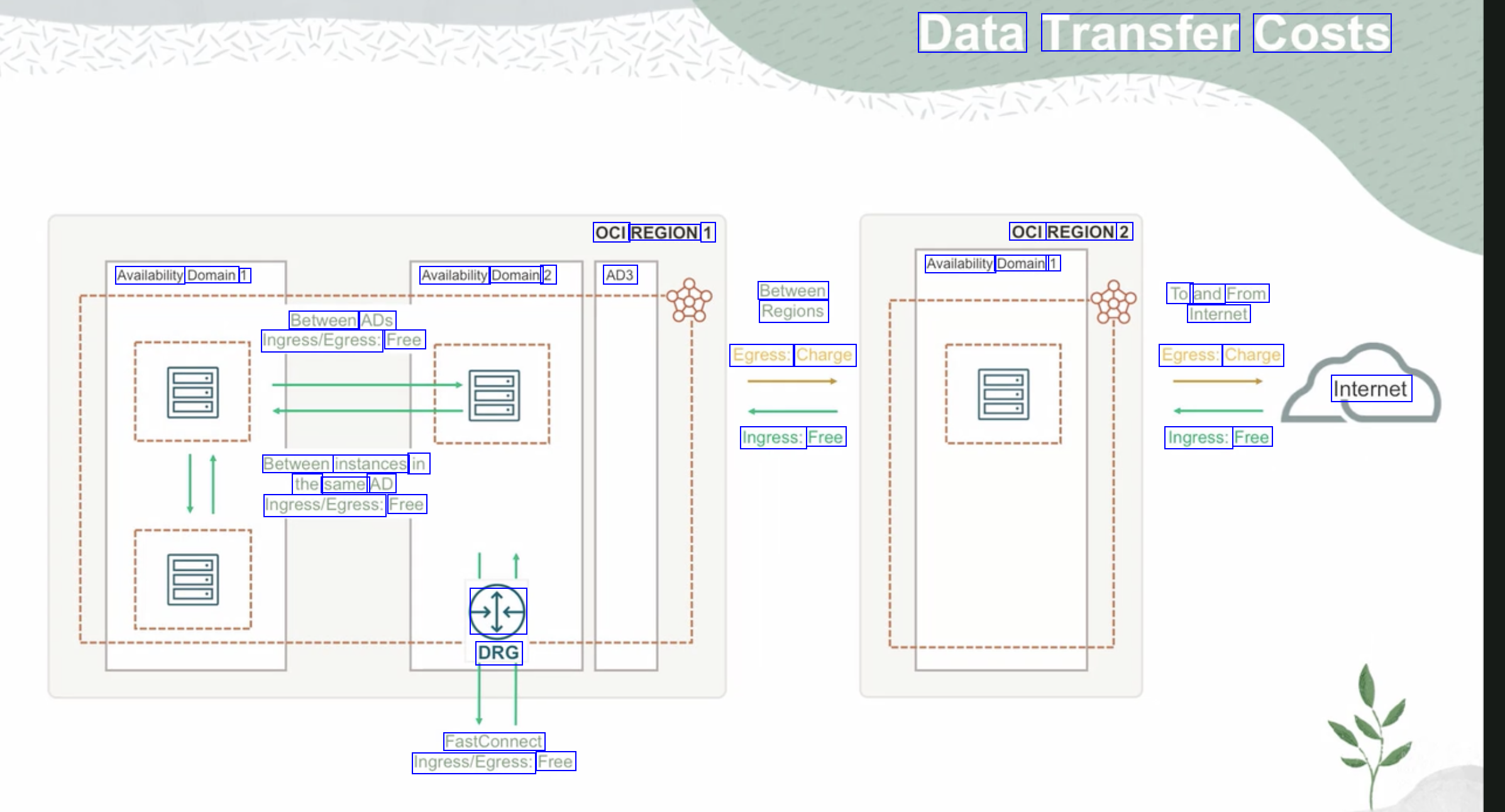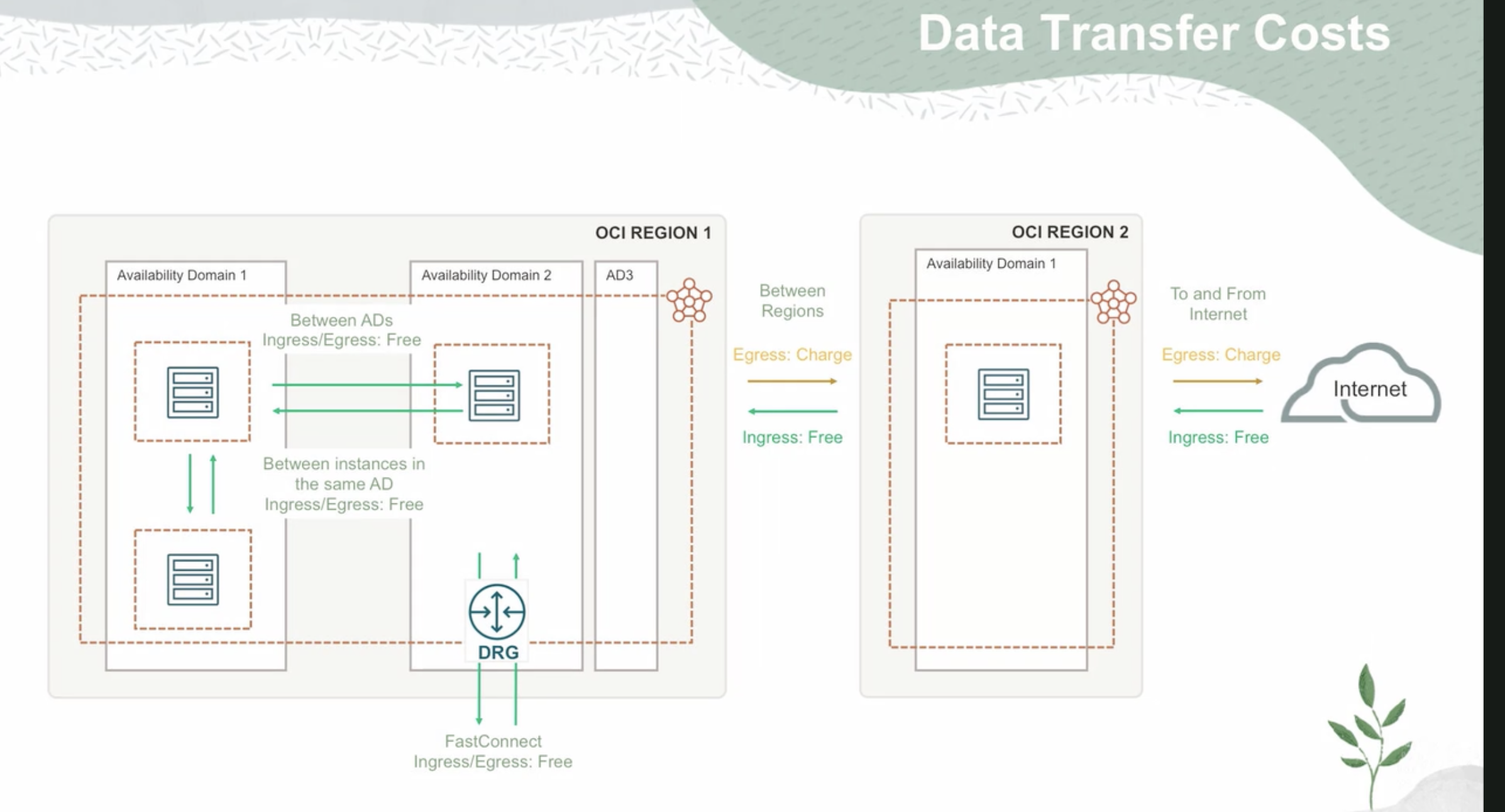 Data Transfer Costs OCI REGION 1 OCI REGION 2 Availability Domain 1 Availability Domain 1 Availability Domain 2 AD3 Between Regions Egress: Charge To and From Internet Egress: Charge Between ADs Ingress/Egress: Free Internet Ingress: Free Ingress: Free Between instances in the same AD Ingress/Egress: Free 414 DRG FastConnect Ingress/Egress: Free