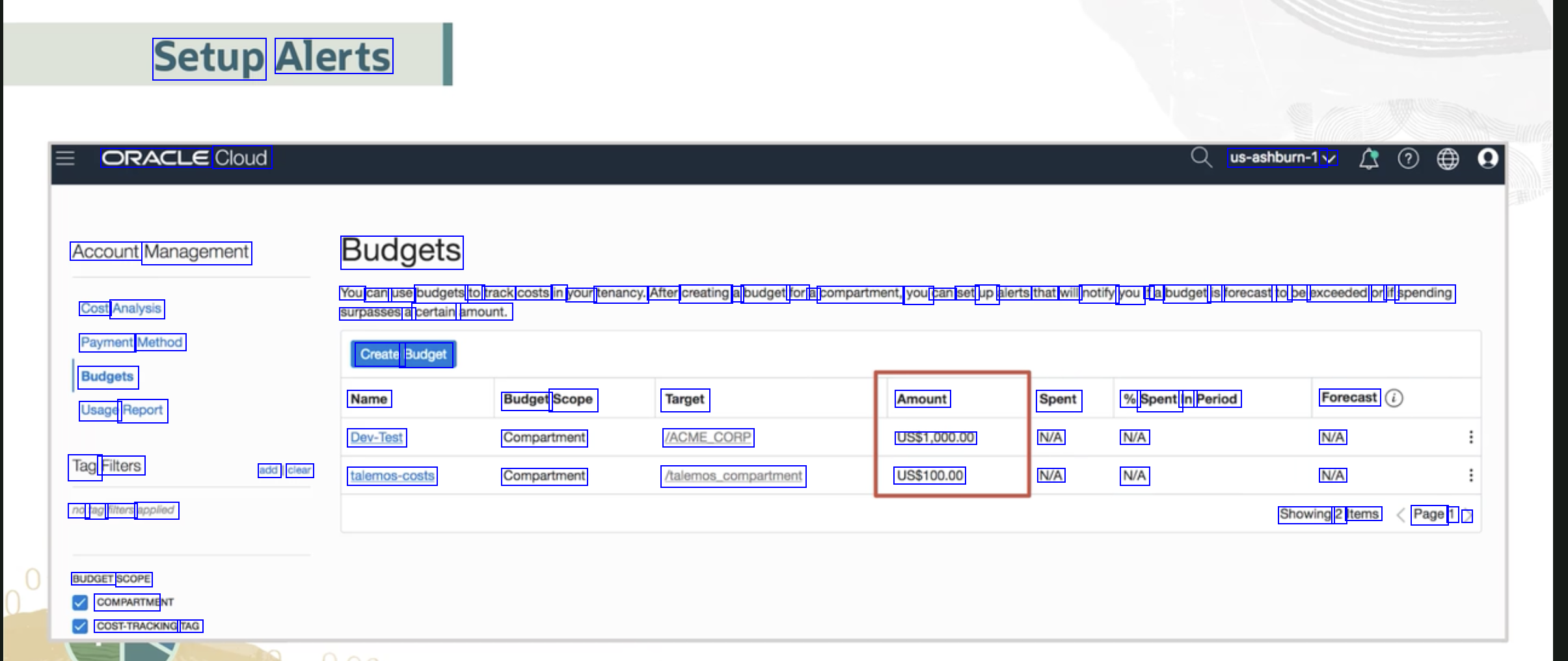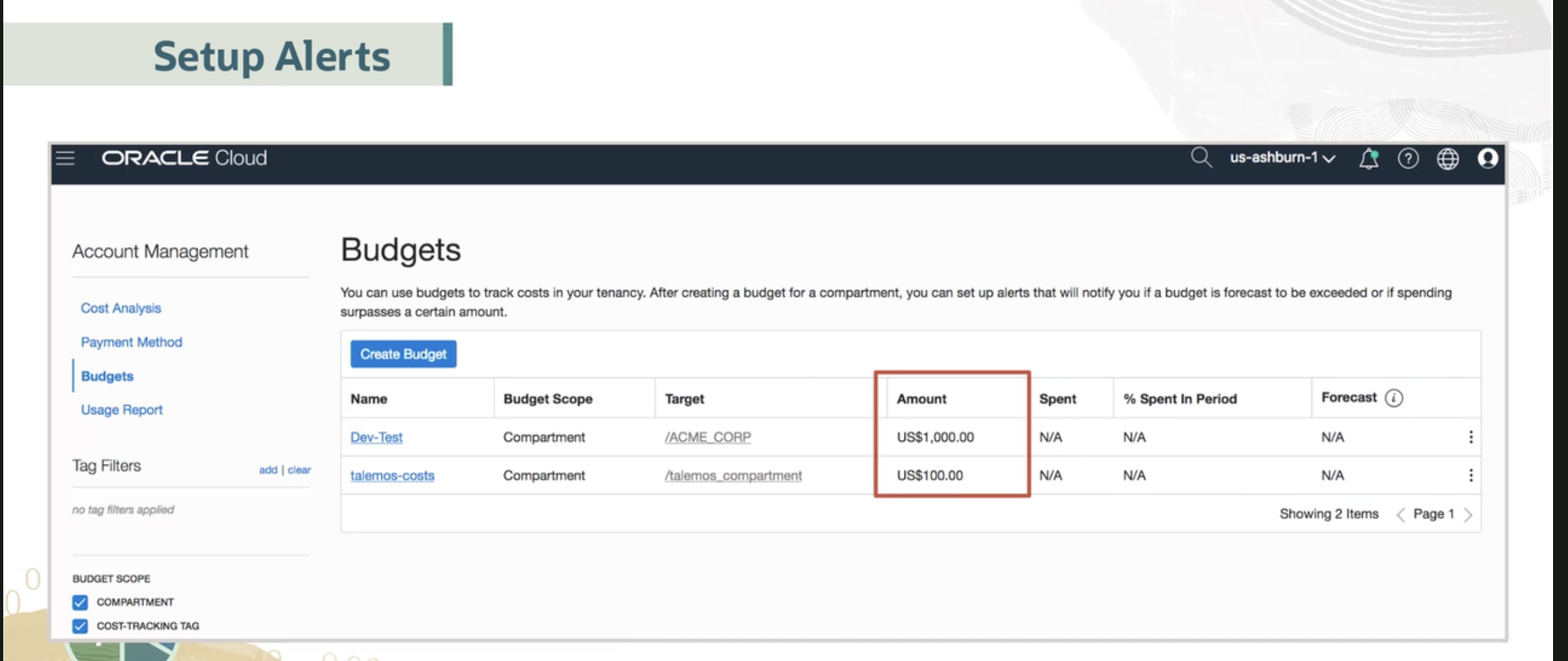Setup Alerts ORACLE Cloud us-ashburn-1 V Account Management Budgets You can use budgets to track costs in your tenancy. After creating a budget for a compartment, you can set up alerts that will notify you if a budget is forecast to be exceeded or if spending Cost Analysis Payment Method Budgets Usage Report surpasses a certain amount. Create Budget Name Dev-Test Budget Scope Compartment Compartment Target (ACME_CORP halemos.compartment Amount USS1,000.00 US$100.00 Spent % Spent In Period Forecast N/A N/A N/A N/A N/A NA Tag Filters add clear talemos-costs no tag filters applied Showing 2 Items Page 1 > BUDGET SCOPE COMPARTME COST-TRACKING TAG