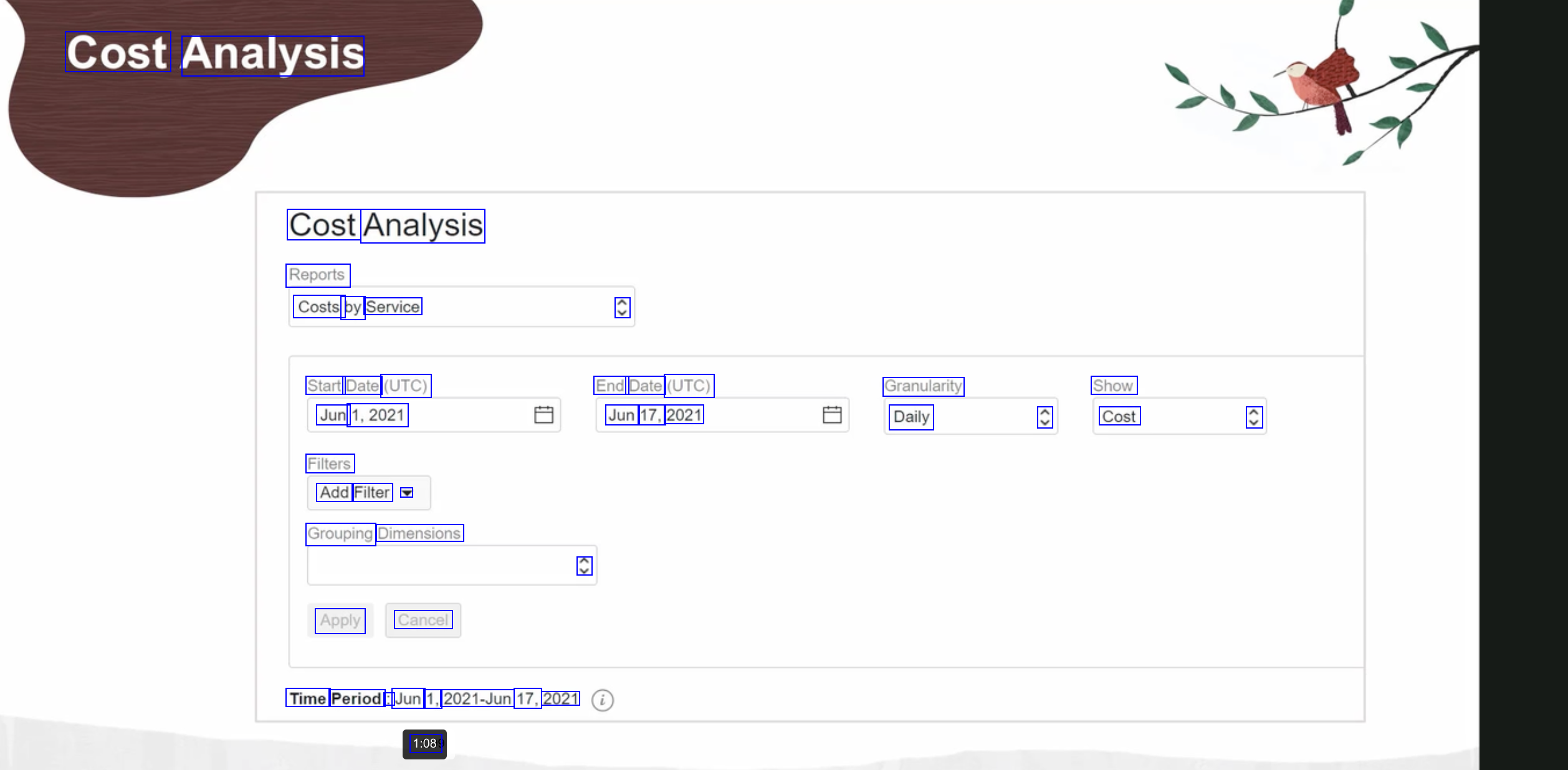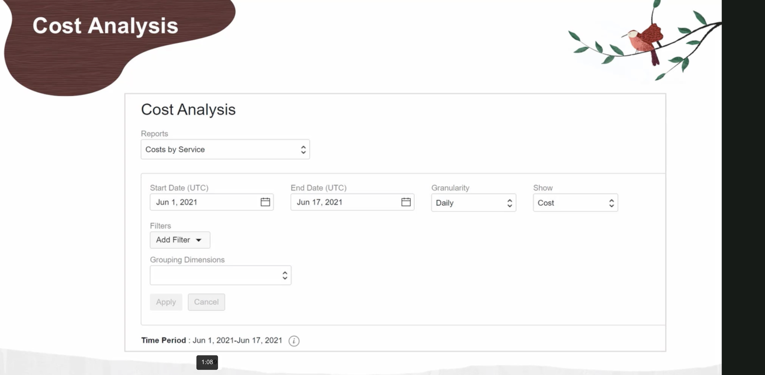 Cost Analysis Cost Analysis Reports Costs by Service C Start Date (UTC) Jun 1,2021 Filters Add Filter Grouping Dimensions End Date (UTC) Jun 17, 2021 Granularity Daily Show C Cost C C Apply Cancel Time Period : Jun 1, 2021-Jun 17, 2021 1:089