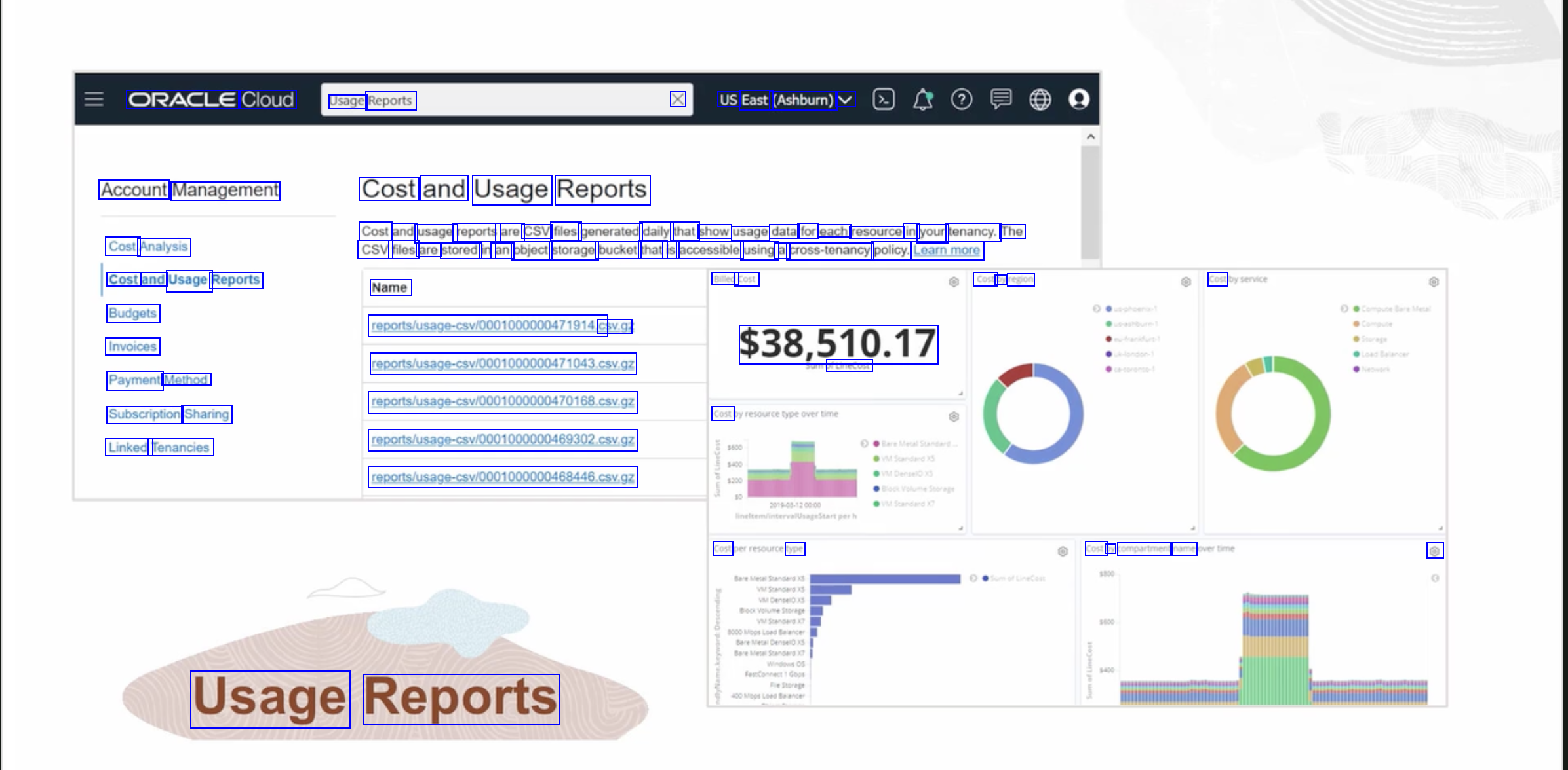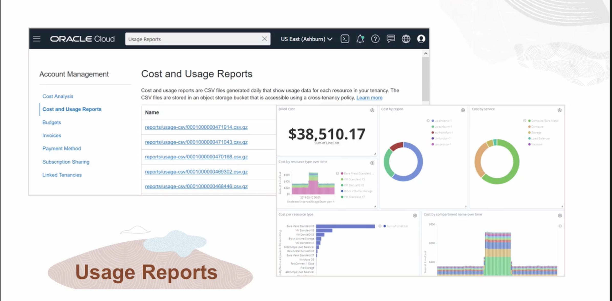 ORACLE Cloud Usage Reports X US East (Ashburn) V Account Management Cost and Usage Reports Cost and usage reports are CSV files generated daily that show usage data for each resource in your tenancy. The CSV files are stored in an object storage bucket that is accessible using a cross-tenancy policy. Learnmore Cost Analysis Cost and Usage Reports Budgets Invoices Payment Method Subscription Sharing Linked Tenancies Name Billed Cost Cost by region Cost wentepraxcengepetNte csv.g2 rep0ts2603ge.cau0000010000040710430N0E repotsbnsage.cau00000100000470168CN92 repotsbsagecau0000010000046932CN9Z 1800153435398:500000100000468460N02 $38,510.17 ofLineCost Cost Cost type Costt by compartment name 0 Usage Reports