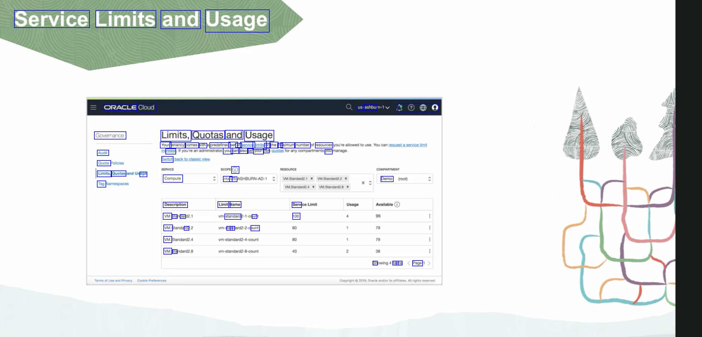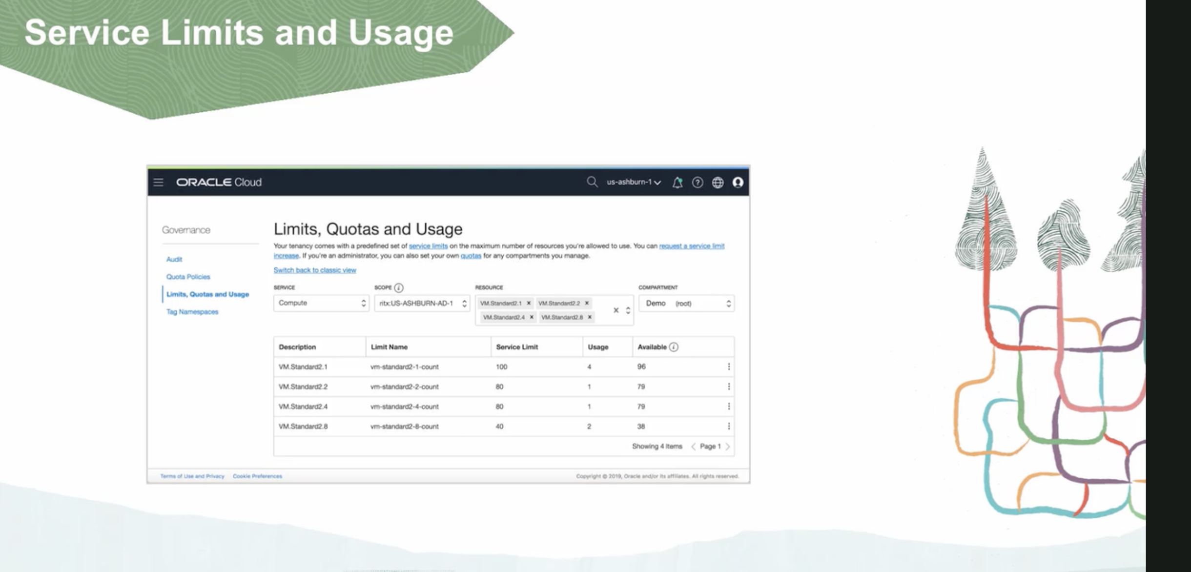 Service Limits and Usage ORACLE Cloud us- ashbu 000 Governance Audit Quotal Limits, Quotas age Tag Limits, Quotas and Usage Your tenancy comes vith predefined set of service limits on the ma aximum number resources rease Switch Compute you can also set your owrt 0 ribcl US you Demo Description VM Sta dar VM. da VM. VM Sta Limit Name standard un tar nd ount Serv 100 Sh ter ms Page
