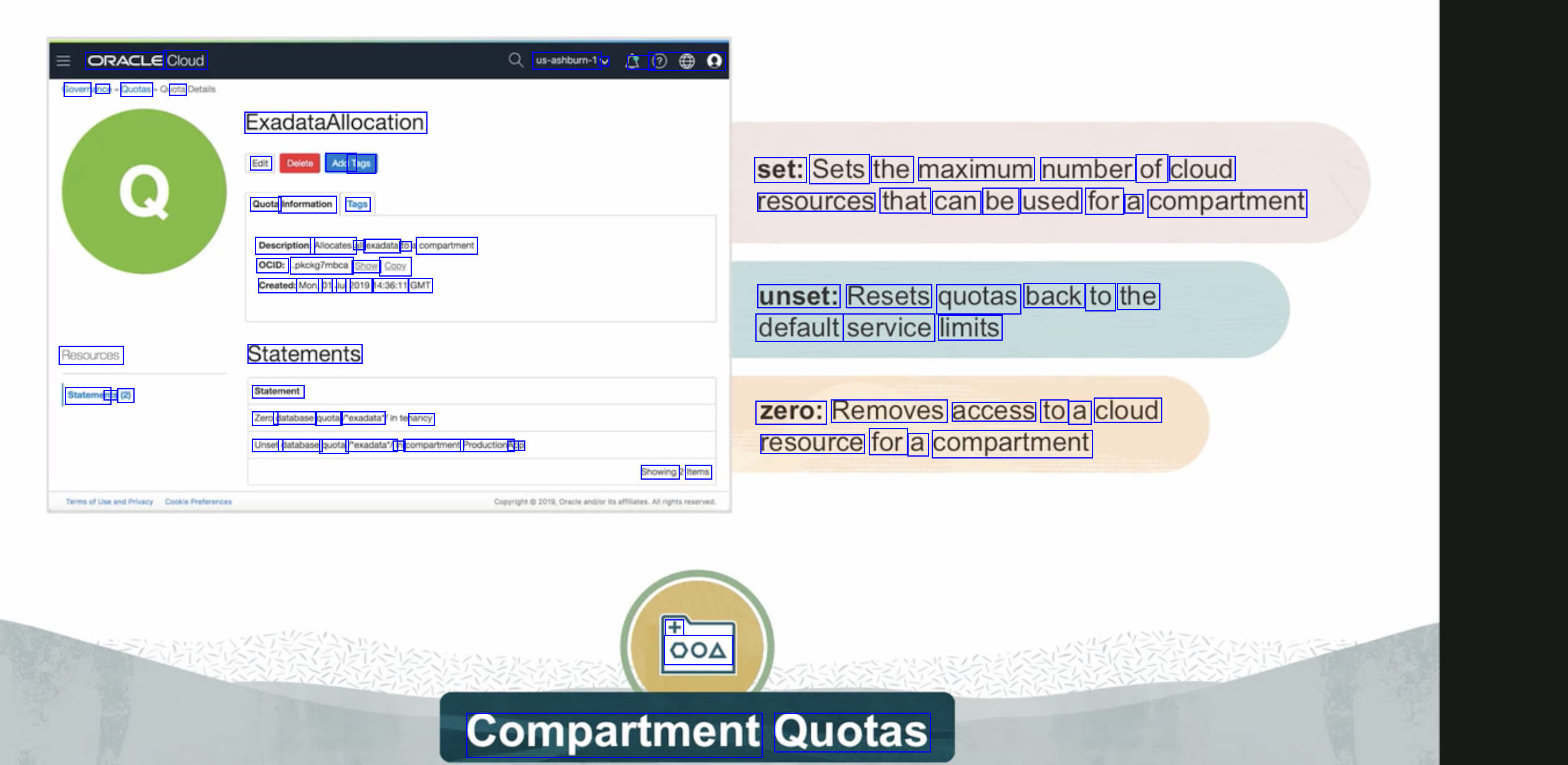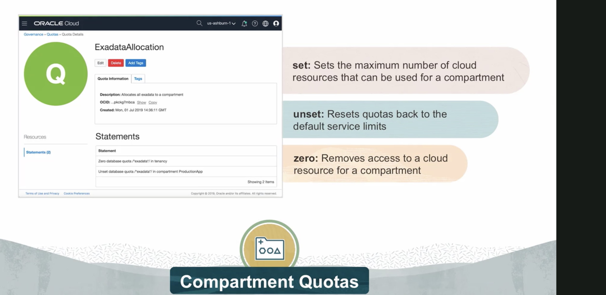 ORACLE Cloud Sovern nce Quotas ota us-ashburn-1 V & 00 ExadataAllocation Edit AddT Tags Quota Information Tags set: Sets the maximum number of cloud resources that can be used for a compartment Description: Allocates all exadata to compartment OCID: pkckg7mbca Show Cony Created: Mon, 01 Jul 2019 14:36:11 GMT unset: Resets quotas back to the default service limits Resources Statement nts (2) Statements Statement Zero database quota Pexadata" nancy Unset database quota l'exadata' in compartment ProductionA Ap pp zero: Removes access to a cloud resource for a compartment Showing Items + OOA Compartment Quotas