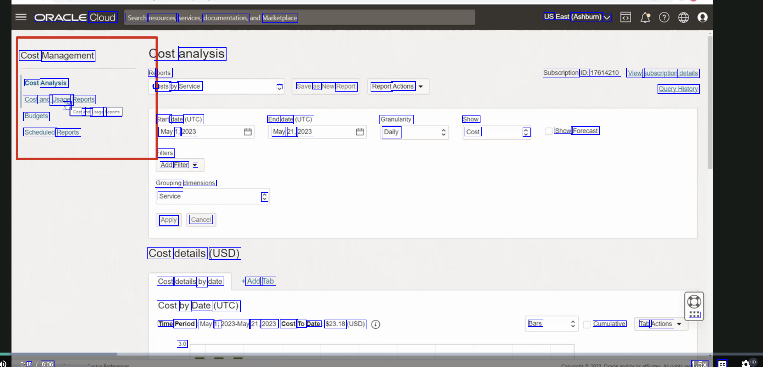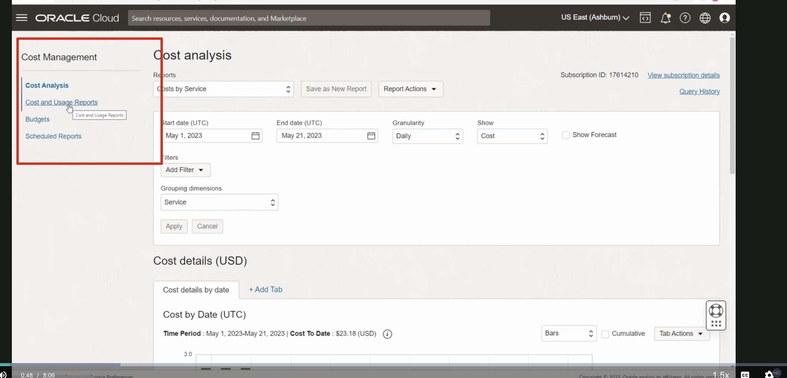 ORACLE Cloud Search resources, services, documentation, and Marketplace US East (Ashburn) V Cost Management ost analysis Re ports a psts by Service Subscription ID: 17614210 View subscription details Cost Analysis Cost and Usage Reports E Costa and Usage Reports Budgets Scheduled Reports L Save as New Report Report Actions QueryHistory Start date (UTC) May 1, 2023 Filters Add Filter V Grouping dimensions Service End date (UTC) May 21, 2023 Granularity Daily Show Cost C Show Forecast C Apply Cancel Cost details (USD) Cost details by date Add Tab Cost by Date (UTC) : Time Period May 1, 2023-May 21, 2023 Cost To Date $23.18 (USD) Bars Cumulative Tab Actions 3.0 18 8:06 1.5x cc