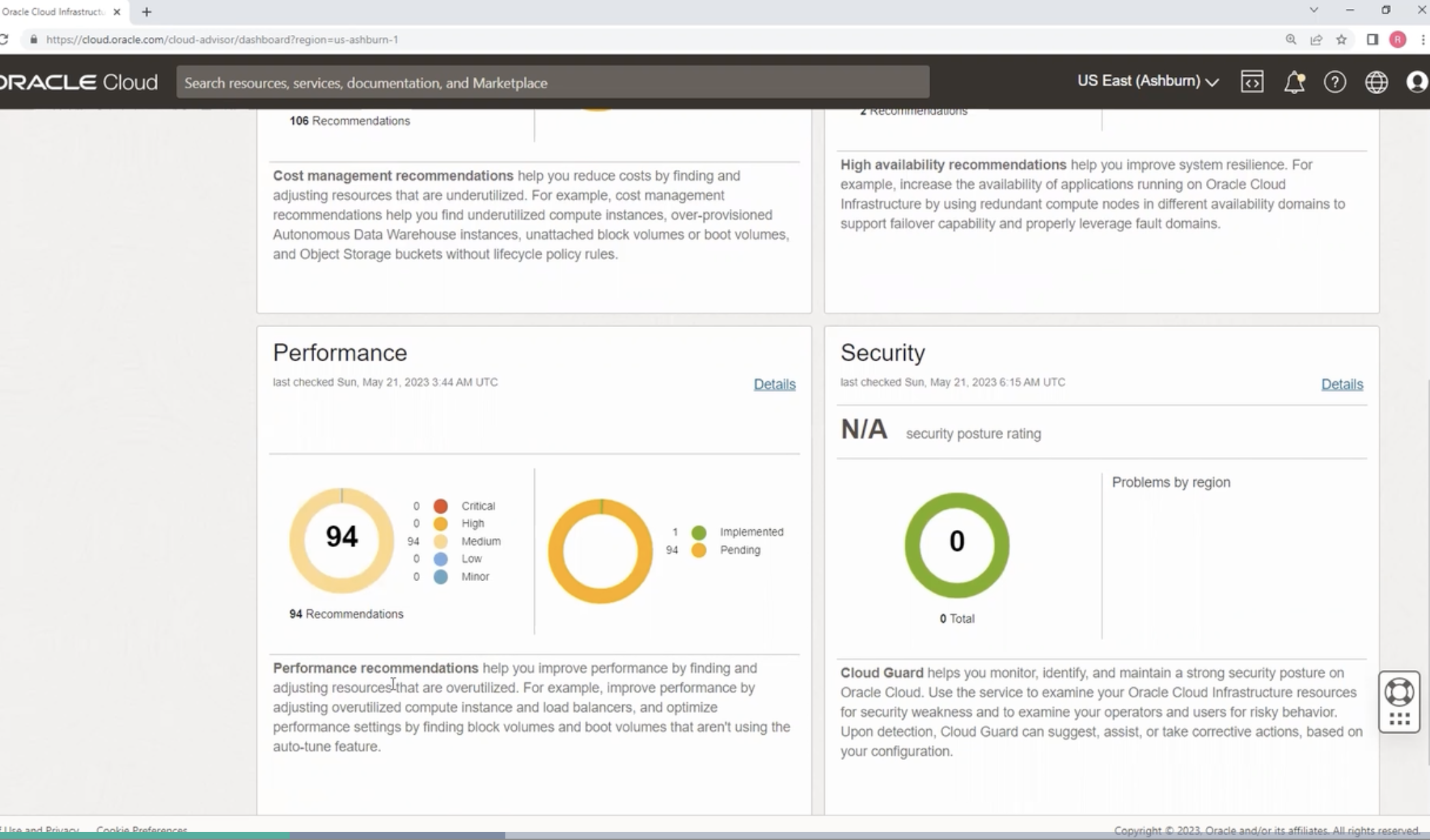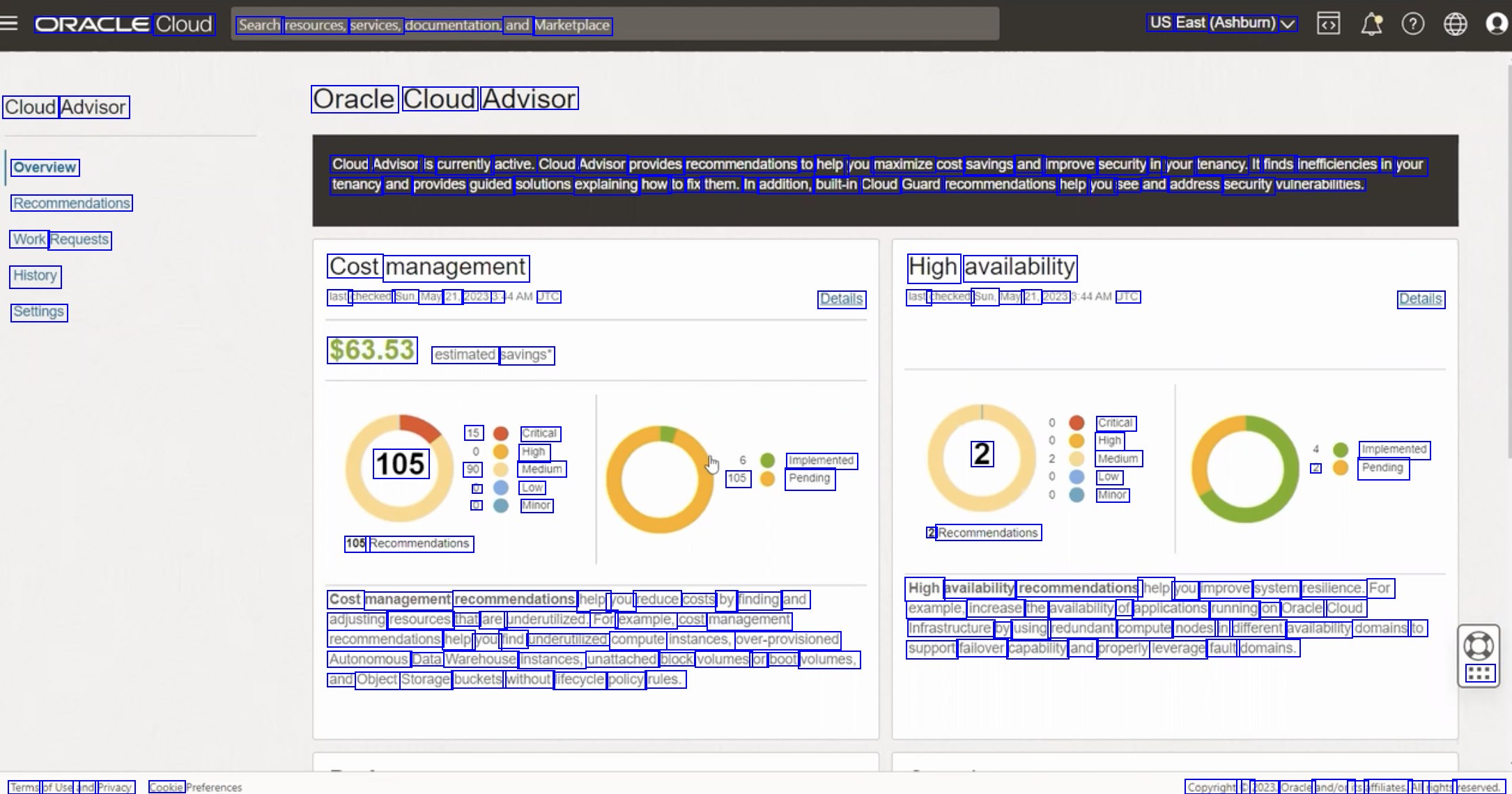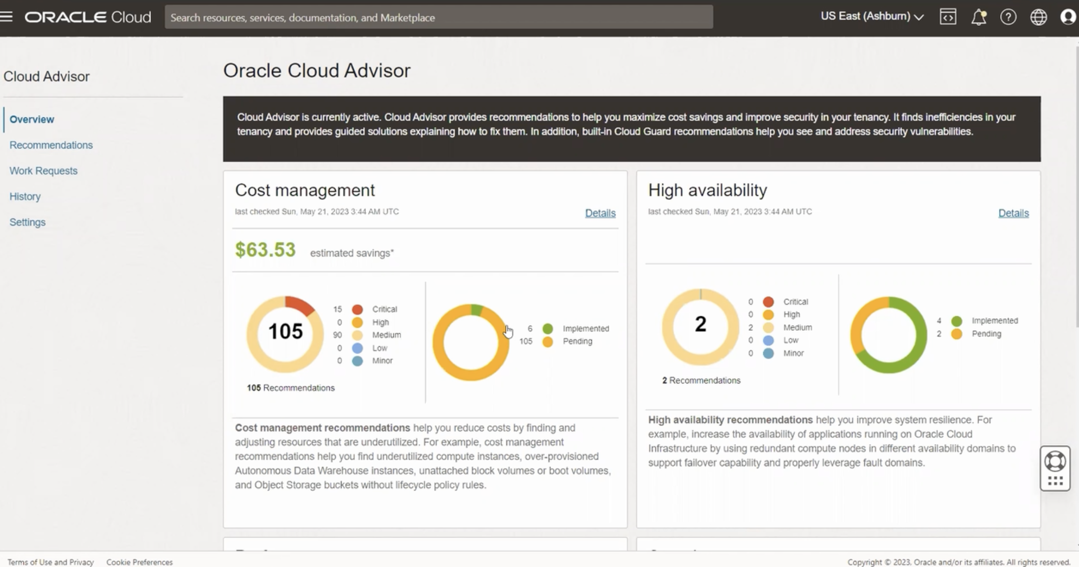 ORACLE Cloud Search resources, services, documentation, and Marketplace US East (Ashbum) V Cloud Advisor Oracle Cloud Advisor Overview Recommendations Work Requests History Settings Cloud Advisor is currently active. Cloud Advisor provides recommendations to help you maximize cost savings and improve security in your tenancy. It finds inefficiencies in your tenancy and provides guided solutions explaining how to fix them. In addition, built-in Cloud Guard recommendations help you see and address security vulnerabilities. Cost management last checked Sun, May 21, 2023 3:4 UTC availability High Details last checked Sun, May 21, 2023 UTC Details $63.53 estimated savings" Critical High Medium Low Minor 15 Critical High 105 90 Medium U Low 0 Minor Implemented 105 Pending 2 Implemented 2 Pending 2 Recommendations 105 Recommendations High availability recommendations help you improve system resilience. For example, increase the availability of applications running on Oracle Cloud Infrastructure by using redundant compute nodes in different availability domains to support failover capability and properly leverage fault domains. Cost management recommendations help you reduce costs by finding and adjusting resources that are underutilized. For example, cost management recommendations help you find underutilized compute instances, over-provisioned Autonomous Data Warehouse instances, unattached block volumes or boot volumes, and Object Storage buckets without lifecycle policy rules. ::: Terms ofUse and Privacy Cookie Copyright o 2023, Oracle and/ori its affiliates. All rights reserved.