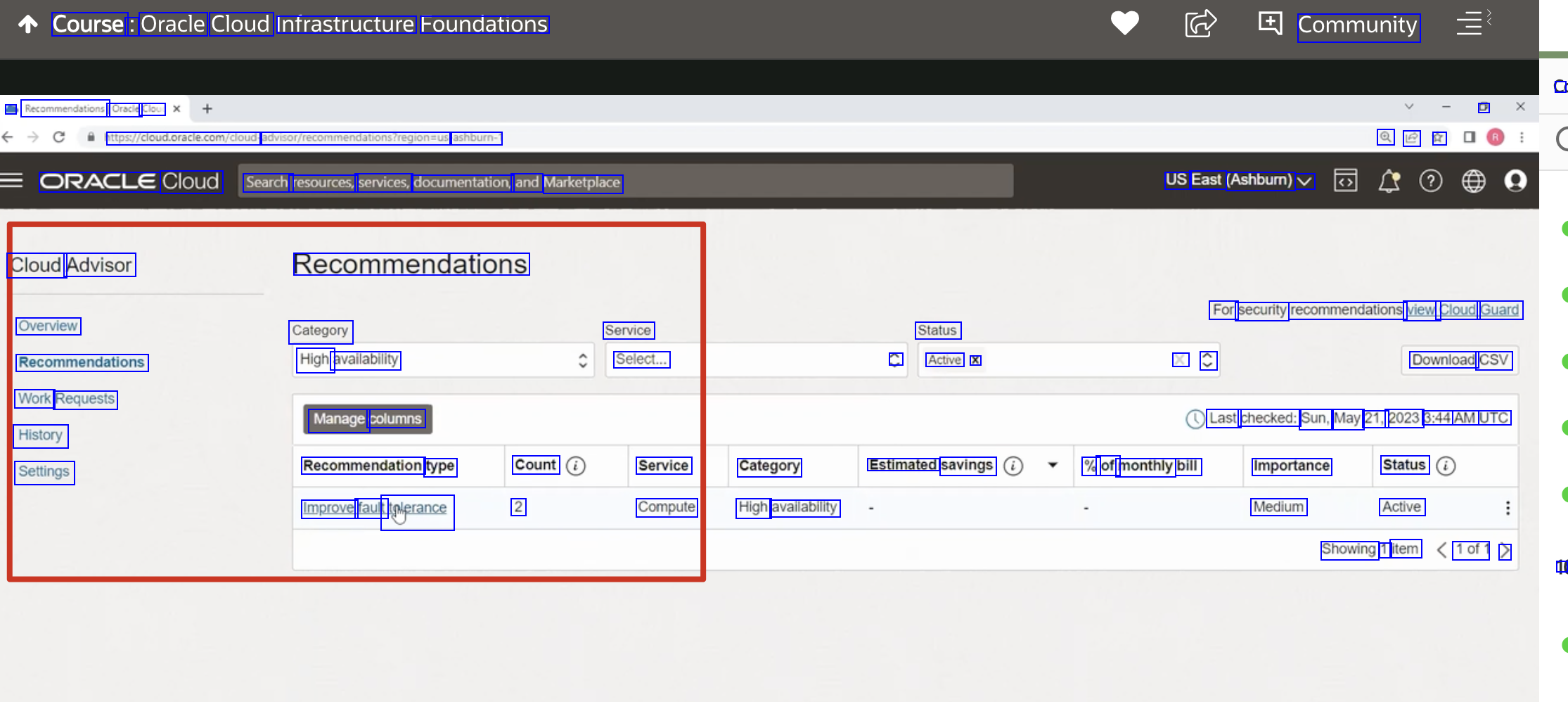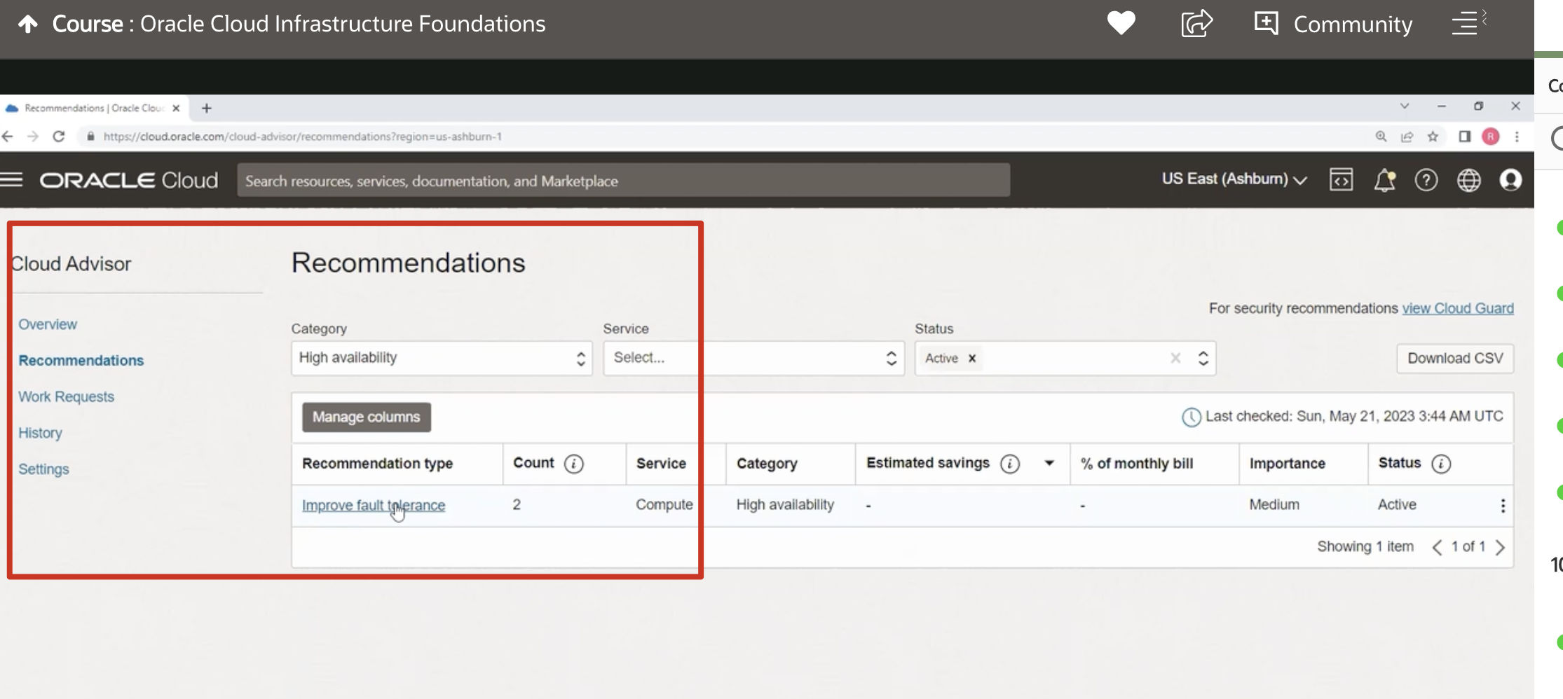 Course : Oracle Cloud Infrastructure Foundations Community D Q le R - Recommendations) Oracle Clour attps/cloud.oracle.com/dloud advsot/frecommendationsregion-us ashburn-1 ORACLE Cloud Search resources, services, documentation, and Marketplace US East (Ashbum) V Cloud Advisor Recommendations For security recommendations view Cloud Guard Overview Recommendations Work Requests History Settings Category High availability Service Select... Status C Active X X C Download CSV Manage columns Last checked: Sun, May 21, 2023 3:44 AM UTC Recommendation type Improve fault Liplerance Count 2 Service Category Compute High availability Estimated savings % of monthly bill Importance Status Medium Active Showing 1 item 1of1 > 10