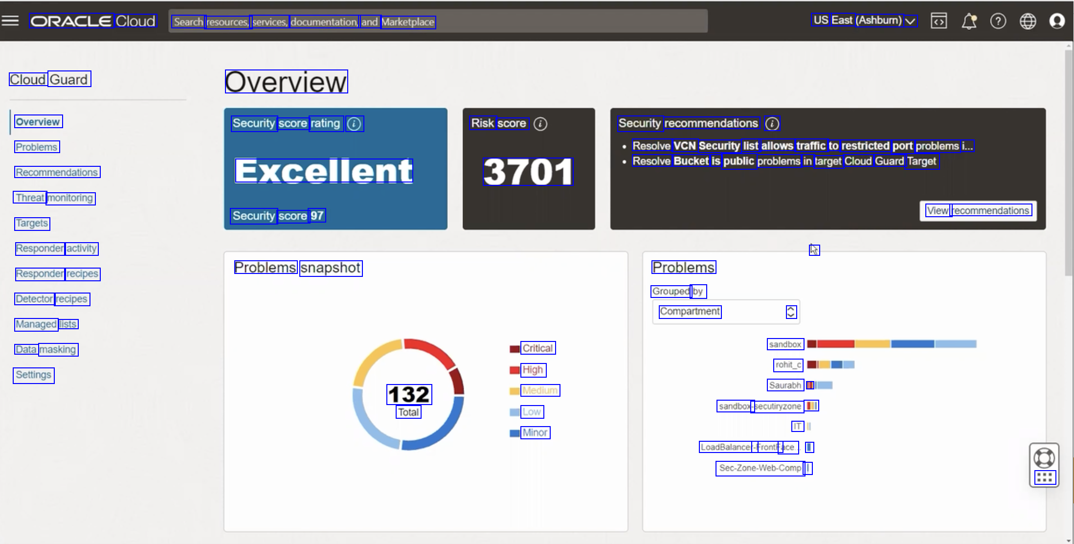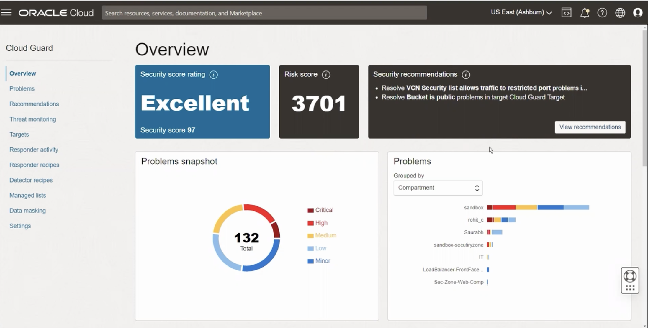 ORACLE Cloud Search resources, services, documentation, and Marketplace US East (Ashbumn) V Cloud Guard Overview Overview Problems Recommendations Threat monitoring Targets Responder activity Responder recipes Detector recipes Managed lists Data masking Settings Security score rating 0 Risk score Security recommendations @ Resolve VCN Security list allows traffic to restricted port problems i... Resolve Bucket is public problems in target Cloud Guard Target Excellent 3701 Security score 97 View recommendations he Problems snapshot Problems Grouped by Compartment C sandbox rohit_c Saurabh ID sandbox- -secutiryzone III Critical High Medium Low Minor 132 Total IT LoadBalancer- -FrontFa Face. I Sec-Zone-Web-Comp I :::