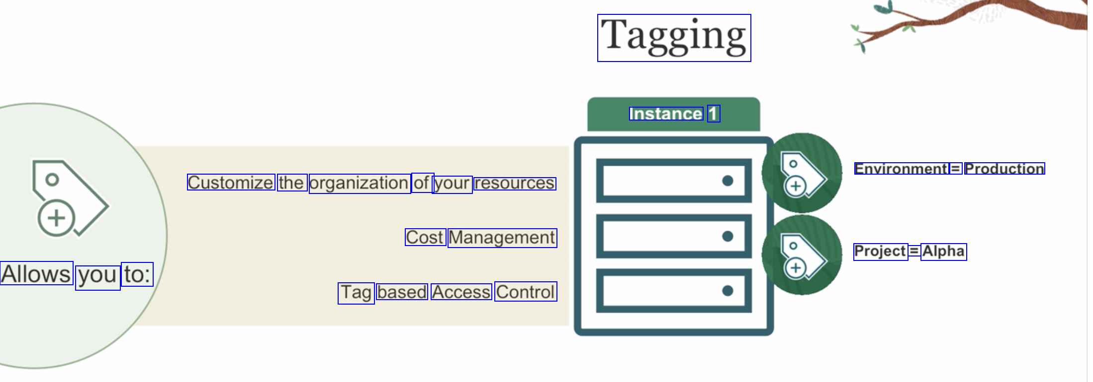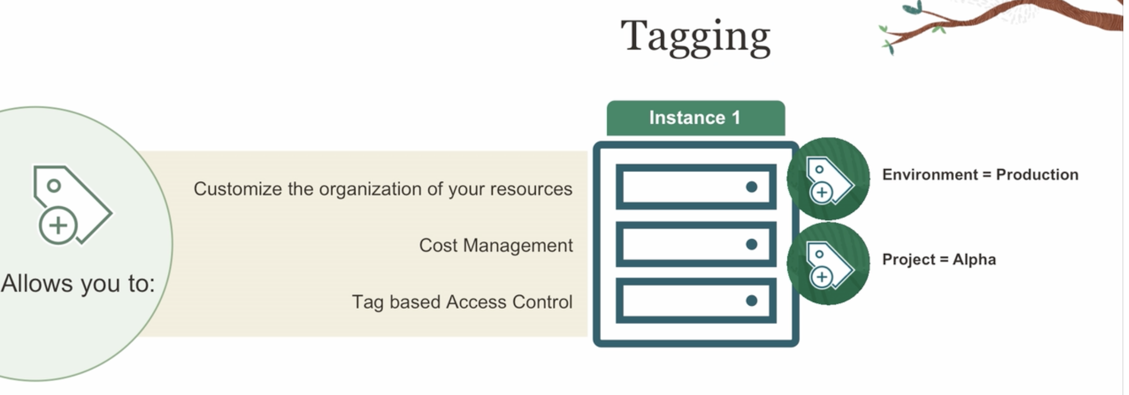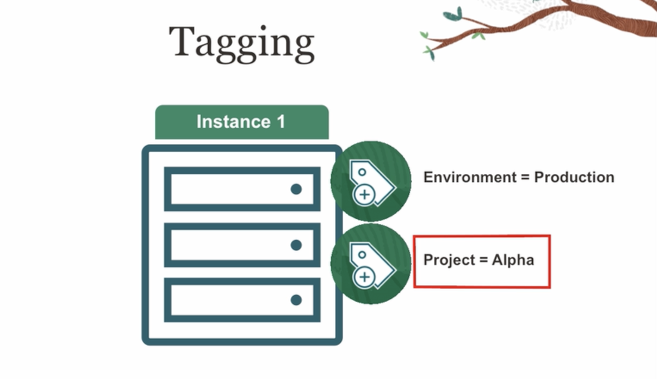 Tagging Instance 1 Environment = Production Customize the organization of your resources Cost Management Project == Alpha Allows you to: Tag based Access Control