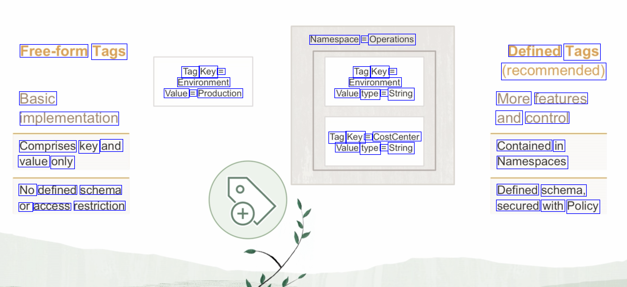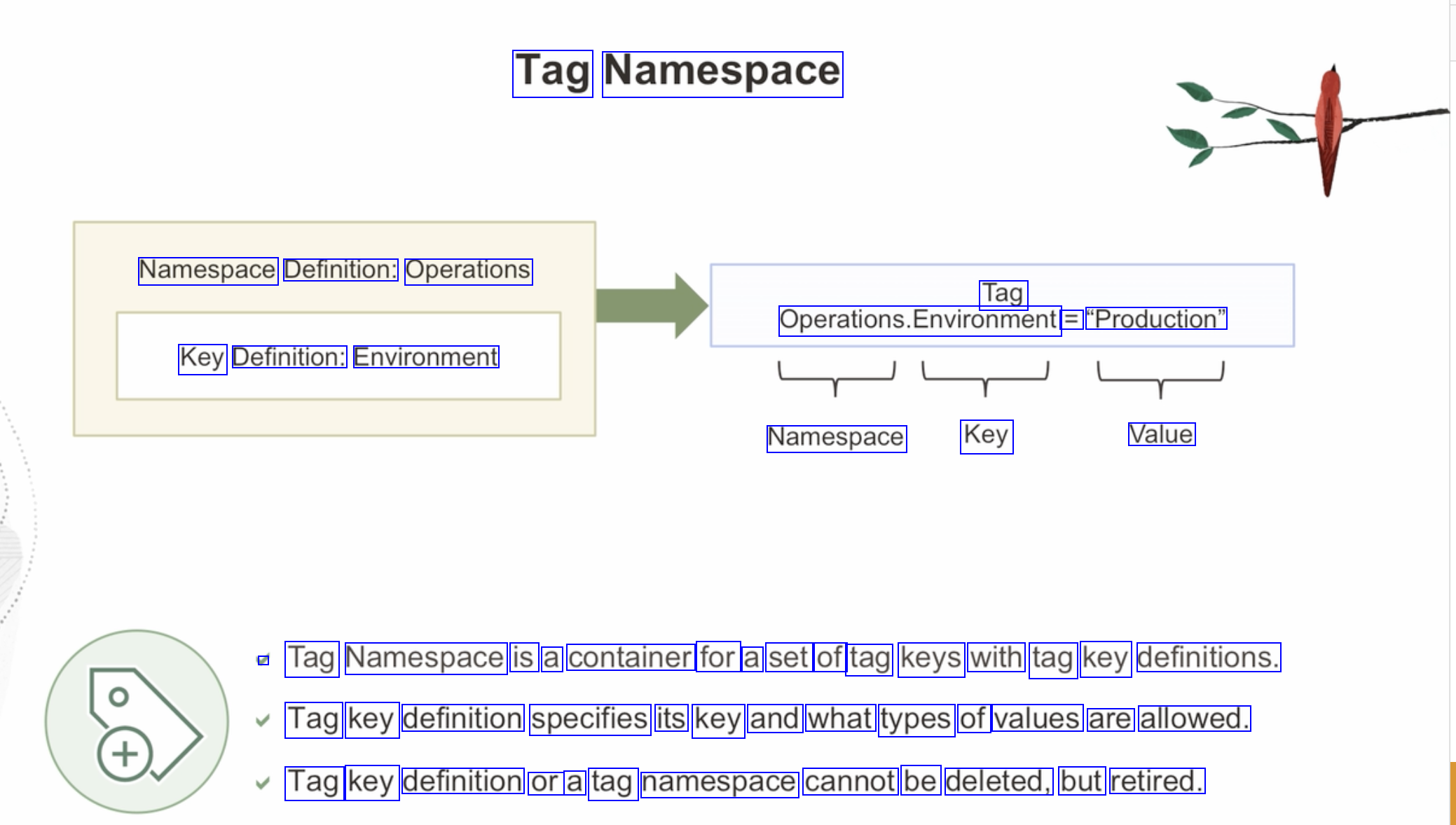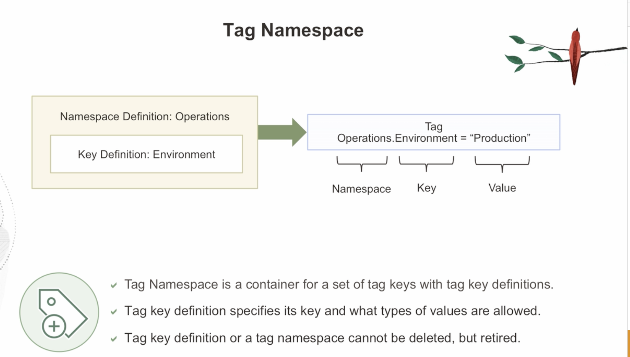 Tag Namespace Namespace Definition: Operations Tag Operations.Environment = "Production" Key Definition: Environment Namespace Key Value - Tag Namespace is a container for a set of tag keys with tag key definitions. Tag key definition specifies its key and what types of values are allowed. Tag key definition or a tag namespace cannot be deleted, but retired.