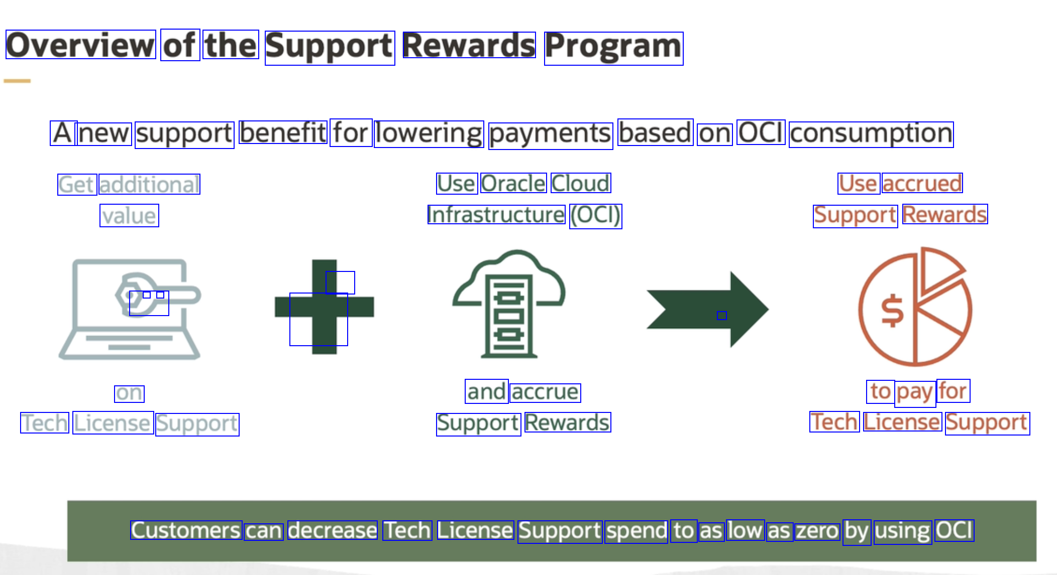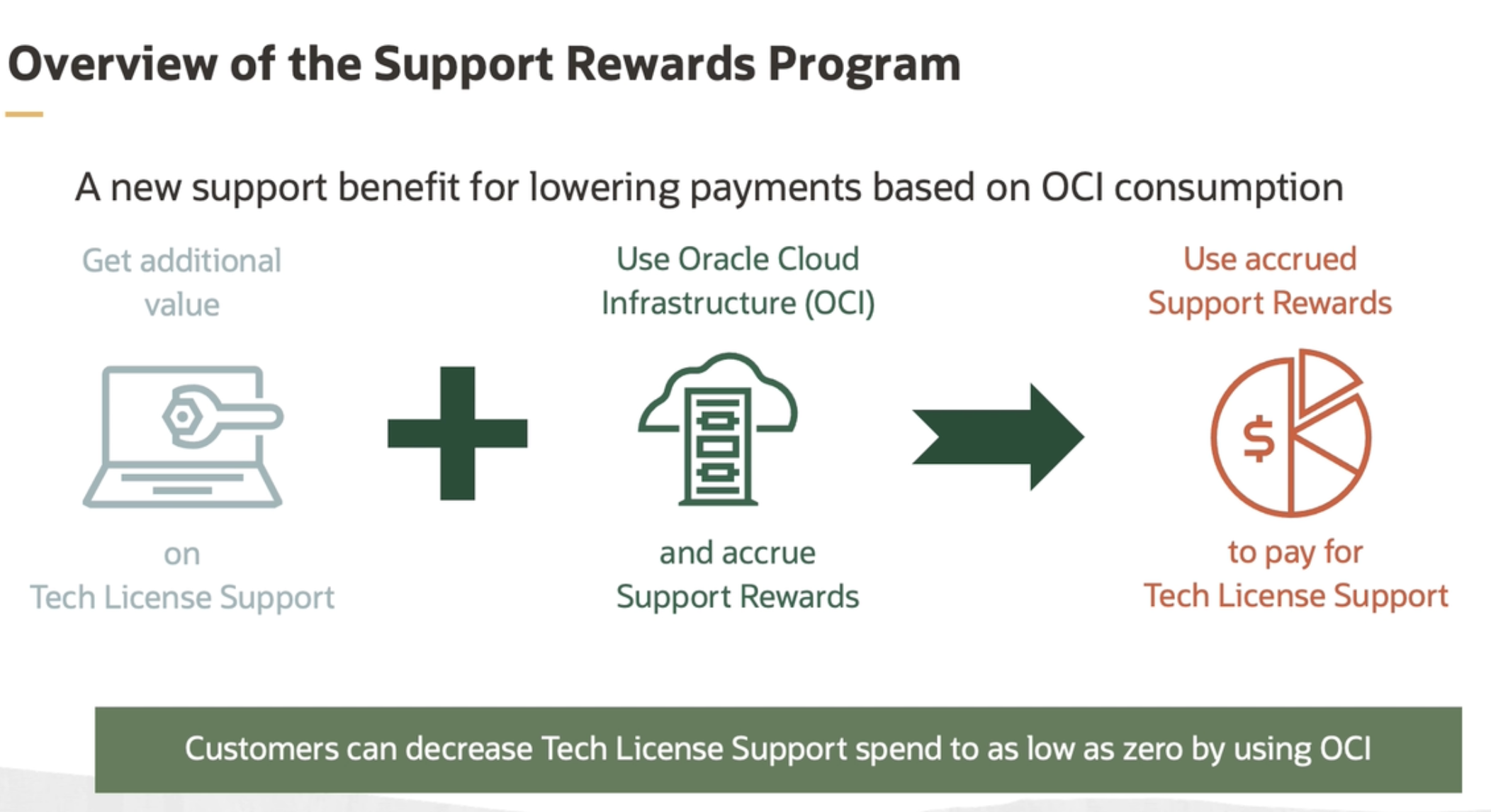 Overview of the Support Rewards Program A new support benefit for lowering payments based on OCI consumption Get additional value Use Oracle Cloud Infrastructure (OCI) Use accrued Support Rewards - - - - - on and accrue Support Rewards to pay for Tech License Support Tech License Support Customers can decrease Tech License Support spend to as low as zero by using OCI