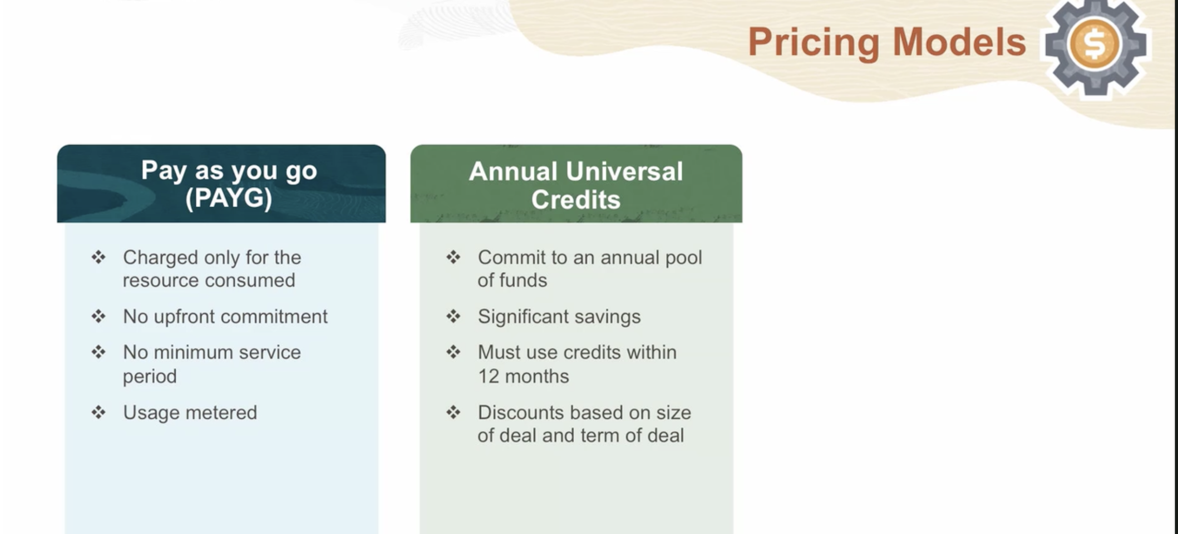 Pricing Models Pay as you go (PAYG) Annual Universal Credits * Charged only for the resource consumed * Commit to an annual pool of funds % No upfront commitment * Significant savings * No minimum service period * Must use credits within 12 months * Usage metered * Discounts based on size of deal and term of deal