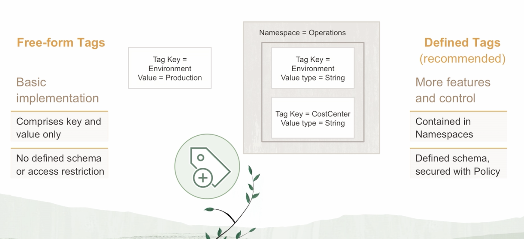 Namespace = Operations Free-form Tags Defined Tags Tag Key == Environment Value = Production Tag Key = Environment Value type = String (recommended) Basic More features implementation and control Tag Key == CostCenter Value type == String Comprises key and value only Contained in Namespaces No defined schema or access restriction Defined schema, secured with Policy