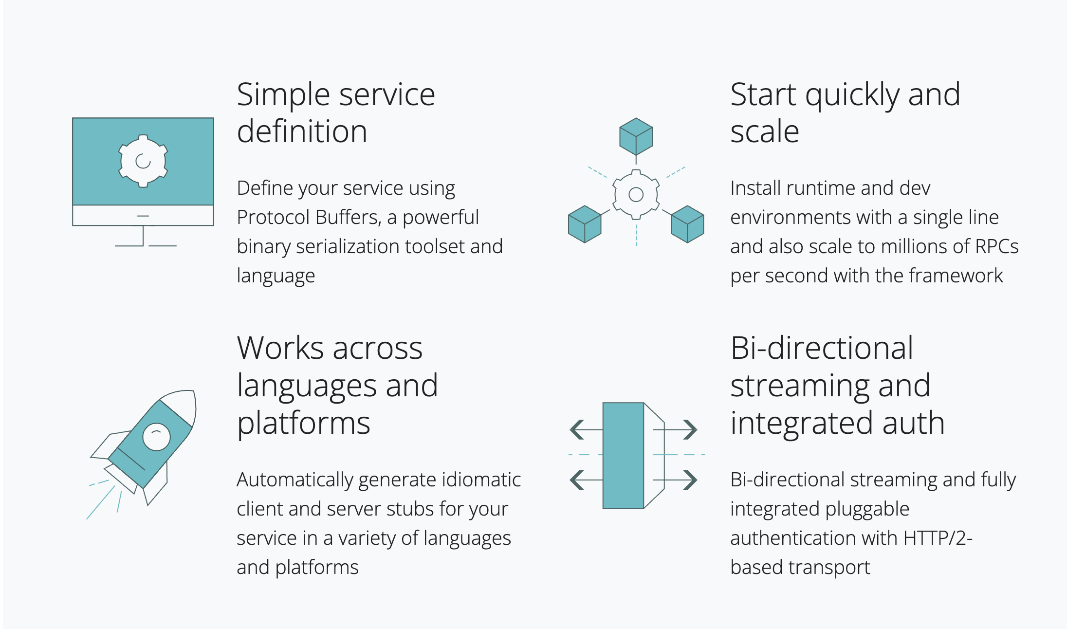 gRPC is a modern open source high performance Remote Procedure Call (RPC) framework that can run in any environment. It can efficiently connect services in and across data centers with pluggable support for load balancing, tracing, health checking and authentication. It is also applicable in last mile of distributed computing to connect devices, mobile applications and browsers to backend services.