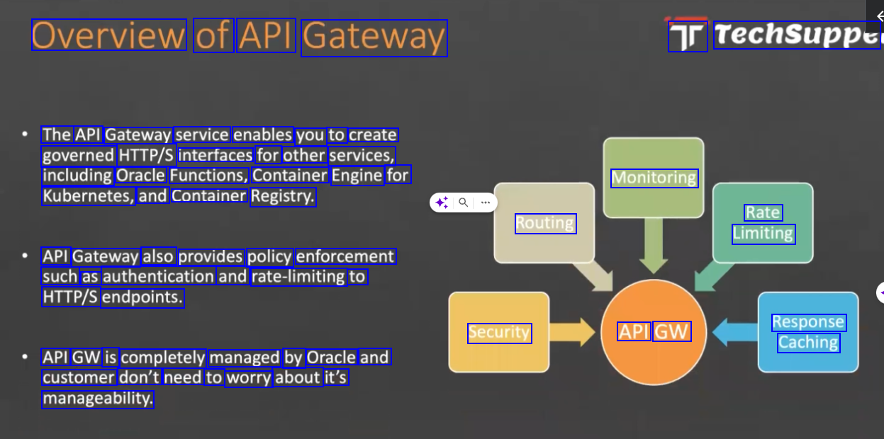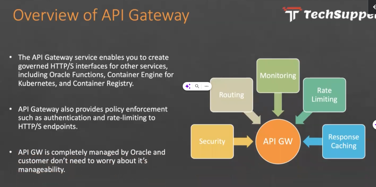 Overview of API Gateway Tr Techsuppe The API Gateway service enables you to create governed HTTP/S interfaces for other services, including Oracle Functions, Container Engine for Kubernetes, and Container Registry. Monitoring Rate Limiting Routing API Gateway also provides policy enforcement such as authentication and rate-limiting to HTTP/S endpoints. Security API GW Response Caching API GW is completely managed by Oracle and customer don't need to worry about it's manageability.