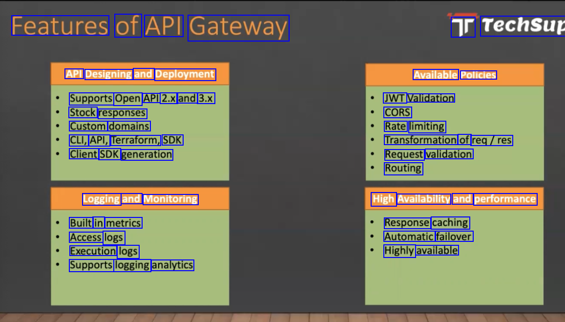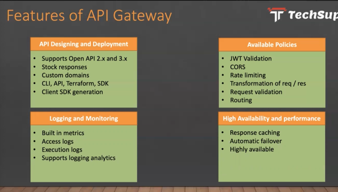 Features of API Gateway Tr TechSup API Designing and Deployment Available Policies Supports Open API 2.x and 3.x Stock responses Custom domains CLI, API, Terraform, SDK Client SDK generation JWT Validation CORS Rate limiting Transformation of req/res Request validation Routing Logging and Monitoring High Availability and performance Built in metrics Access logs Execution logs Response caching Automatic failover Highly available Supports logging analytics