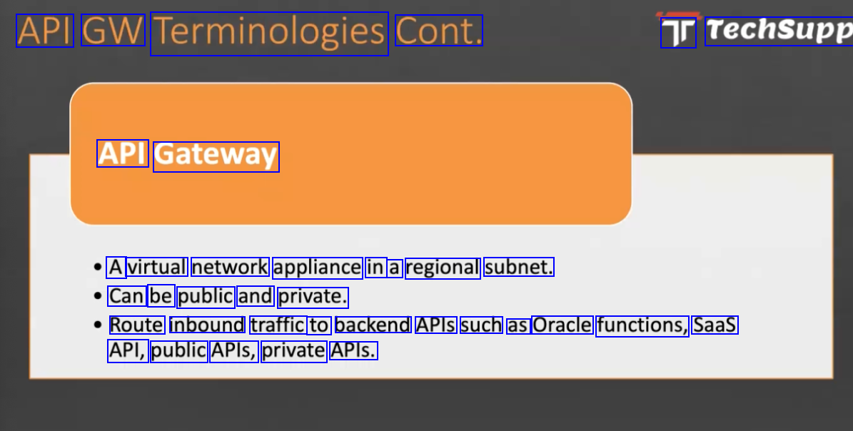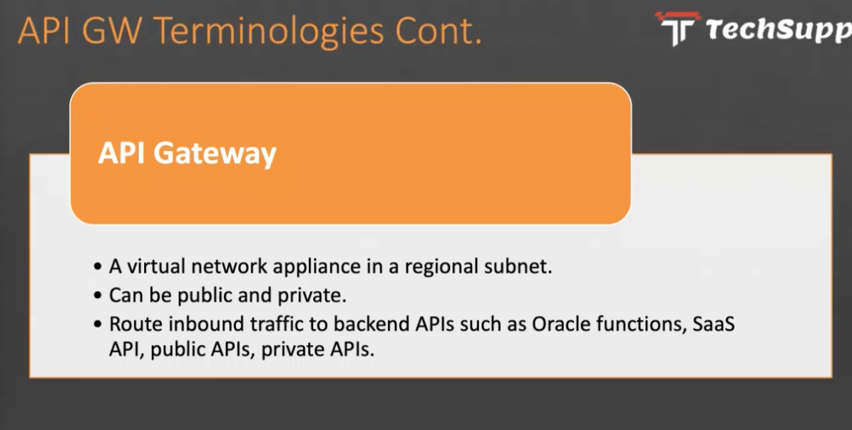 API GW Terminologies Cont. Tr Techsupp API Gateway A virtual network appliance in a regional subnet. Can be public and private. Route inbound traffic to backend APIS such as Oracle functions, Saas API, public APIs, private APIs.