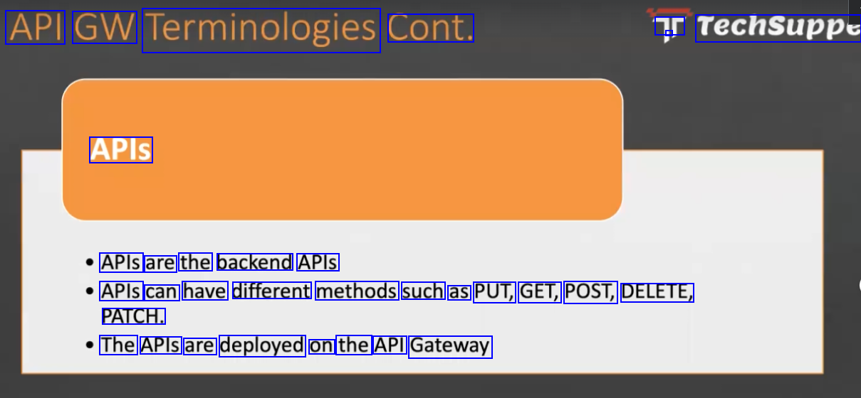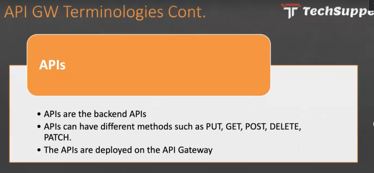 API GW Terminologies Cont. r - Techsuppe APIS APls are the backend APIS APls can have different methods such as PUT, GET, POST, DELETE, PATCH. The APIS are deployed on the API Gateway