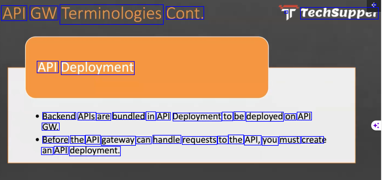 - API GW Terminologies Cont. - Techsupper API Deployment Backend APIs are bundled in API Deployment to be deployed on API GW. Before the API gateway can handle requests to the API, you must create an API deployment.