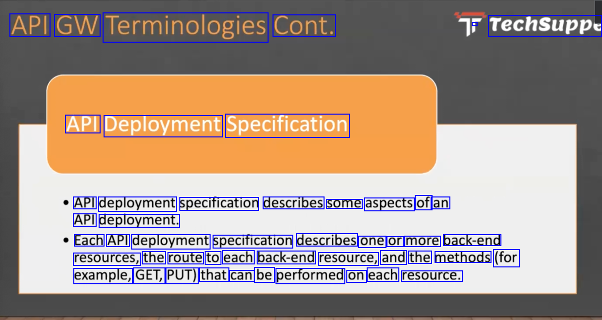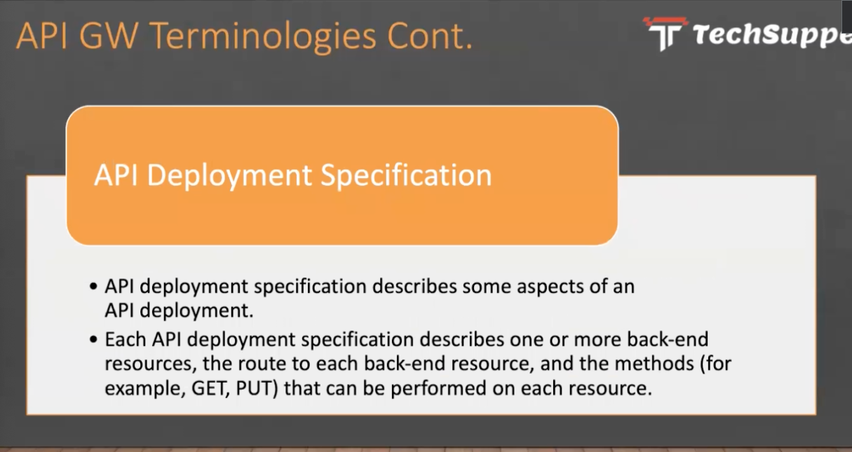 API GW Terminologies Cont. - Techsuppe API Deployment Specification API deployment specification describes some aspects of an API deployment. Each API deployment specification describes one or more back-end resources, the route to each back-end resource, and the methods (for example, GET, PUT) that can be performed on each resource.