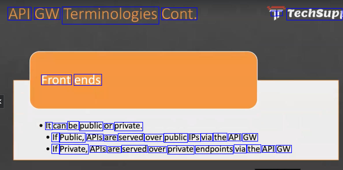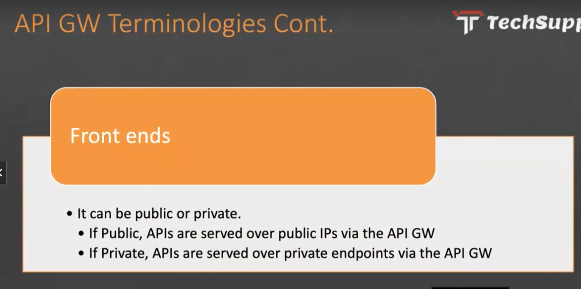 API GW Terminologies Cont. - I Techsupi Front ends It can be public or private. If Public, APIS are served over public IPs via the API GW If Private, APIS are served over private endpoints via the API GW