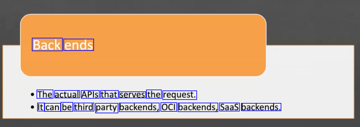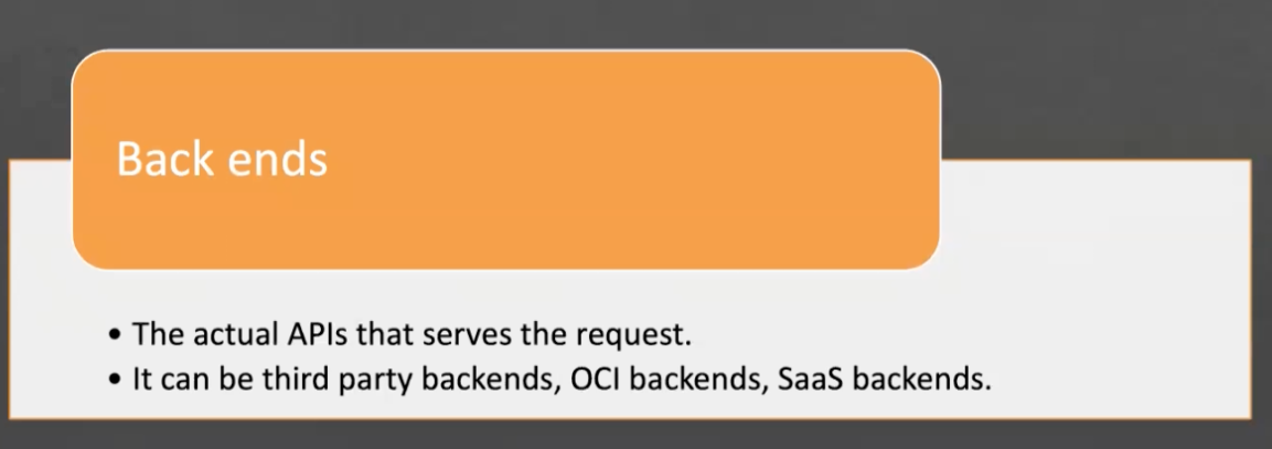 Back ends The actual APls that serves the request. It can be third party backends, OCI backends, Saas backends.