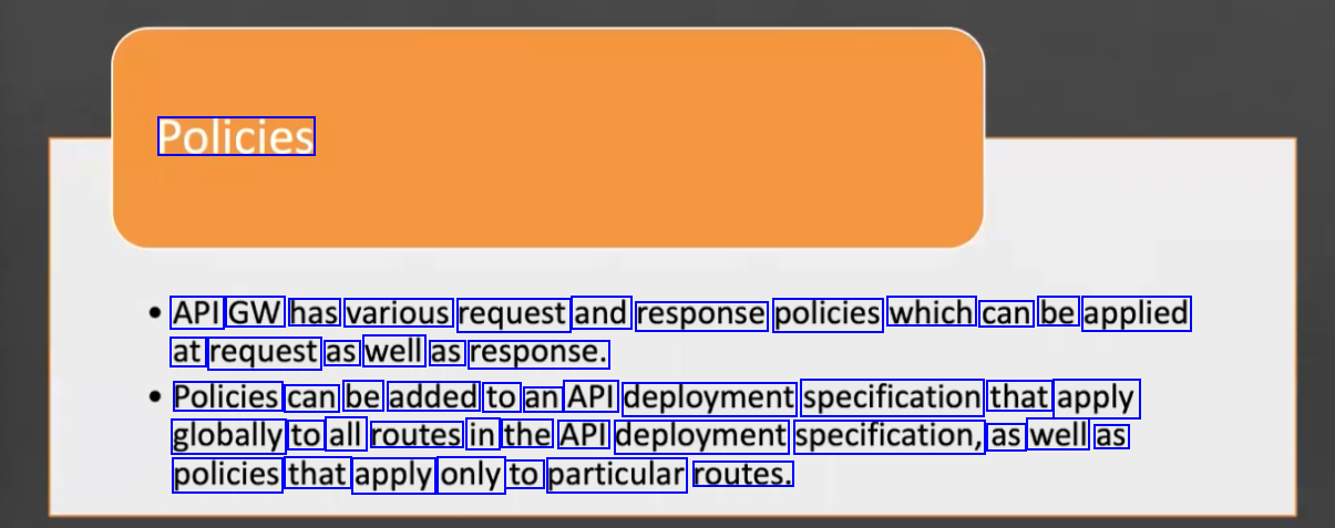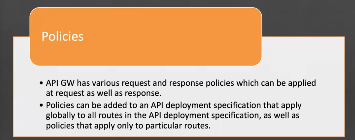 Policies API GW has various request and response policies which can be applied at request as well as response. Policies can be added to an API deployment specification that apply globally to all routes in the API deployment specification, as well as policies that apply only to particular routes.