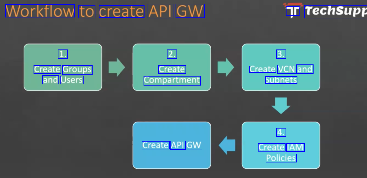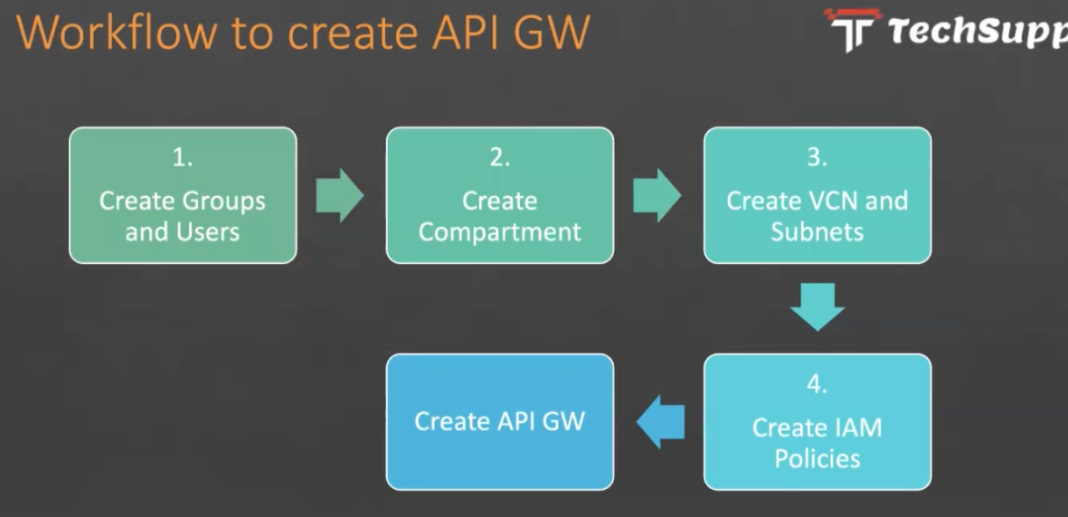 Workflow to create API GW r Techsupp 1. 2. 3. Create Groups and Users Create Create VCN and Compartment Subnets 4. Create API GW Create IAM Policies
