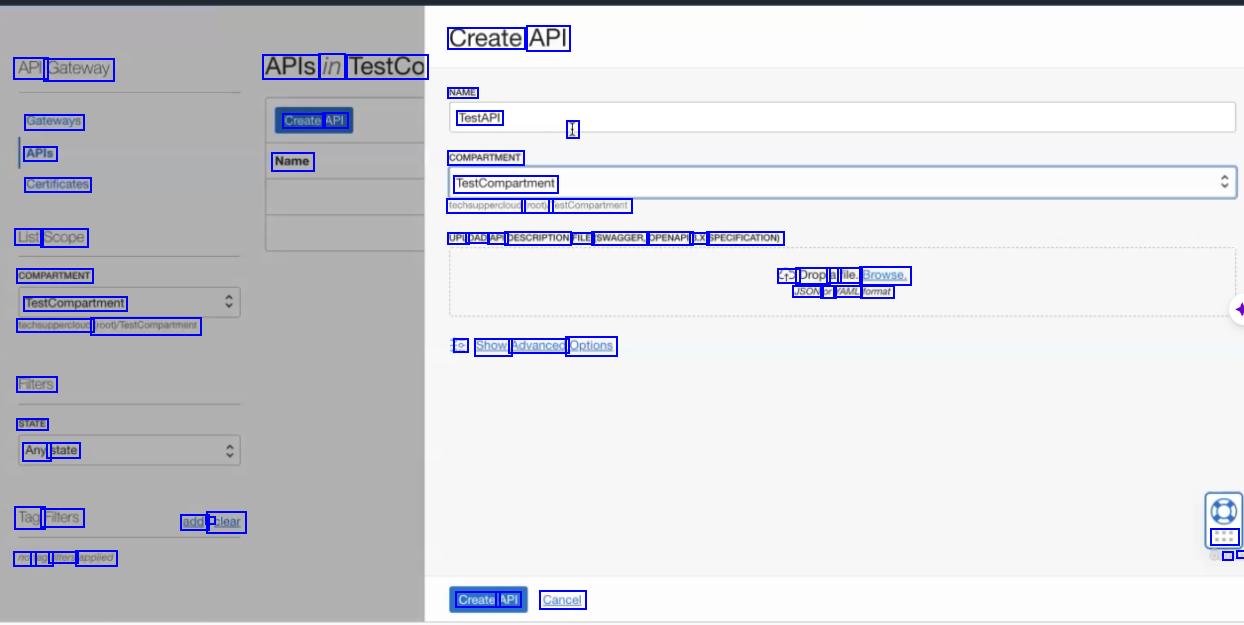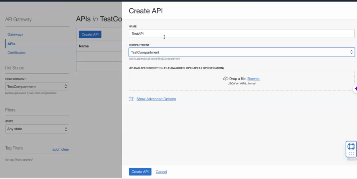 Create API API Gateway APIs in TestCo NAME TestAPI Gateways APIs Certificates Create API I Name COMPARTMENT TestCompartment techsuppercloud (root TestCompartment List Scope COMPARTMENT TestCompartment techsuppercloud foot/RestiCompartment UPLI OAD API DESCRIPTION FILE (SWAGGER, OPENAPI 3.X SPECIFICATION) Drop a file. Browse, JSON or YAML format o Show Advanced Options Fiters STATE Any state Tag Filters add I clear : a - no tag hiters applied Create API Cancel