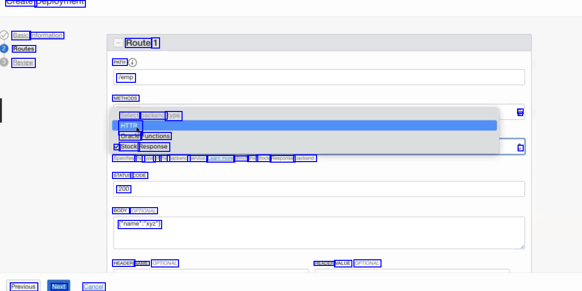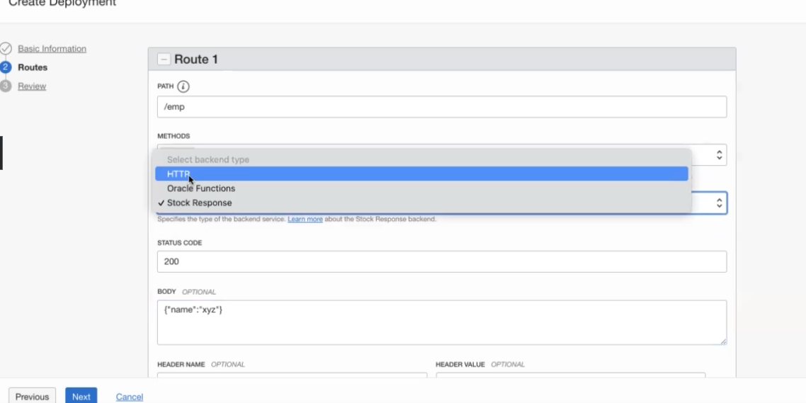 vicalel Depicymlent Basic Information Routes Review Route 1 PATH /emp METHODS Select backend type HTTR, Oracle Functions V Stock Response - - - Specifies the type of the backend service. Learnmore about the Stock Response backend. STATUS CODE 200 BODY OPTIONAL ("name":"xyz") HEADER NAME OPTIONAL HEADER VALUE OPTIONAL Previous Next Cancel