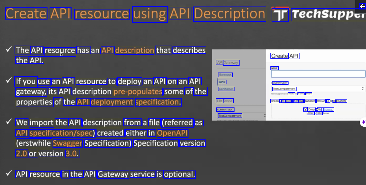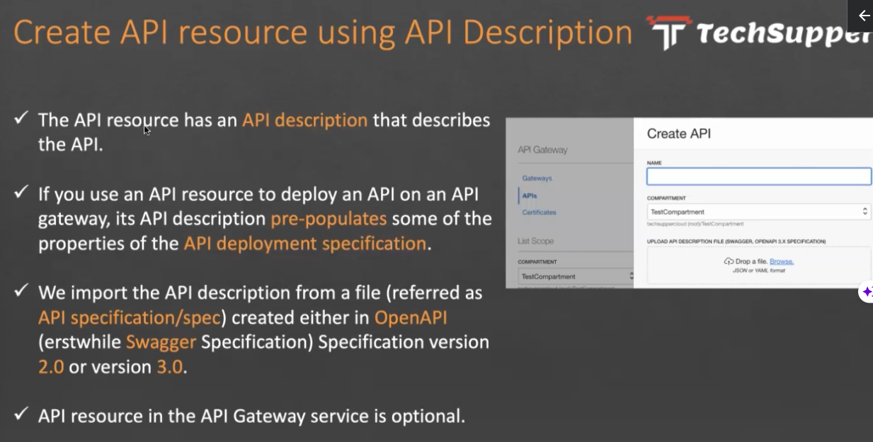€ Create API resource using API Description Tr TechSupper The API resource has an API description that describes Create API the API. API Gateway NAME Gateways APIs Ifyou use an API resource to deploy an API on an API OMPARTMENT TestCompartment prootin Comp tment gateway, its API description pre-populates some of the Certificates properties of the API deployment specification. List Scope COMPARTMENT TestCompartment UPLOAD API ESCRIR Pr TION FILE (SWAGGER OPENAPI ax C I IFICATION € Drop a file. Browse, JSON YAME We import the API description from a file (referred as API specification/Spec) created either in OpenAPI (erstwhile Swagger Specification) Specification version 2.0 or version 3.0. API resource in the API Gateway service is optional.
