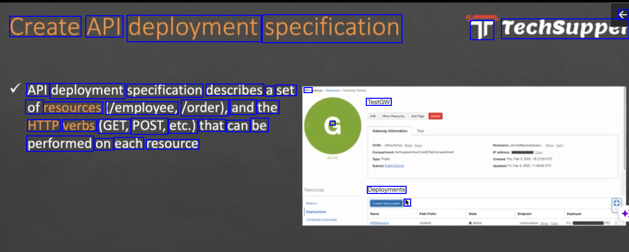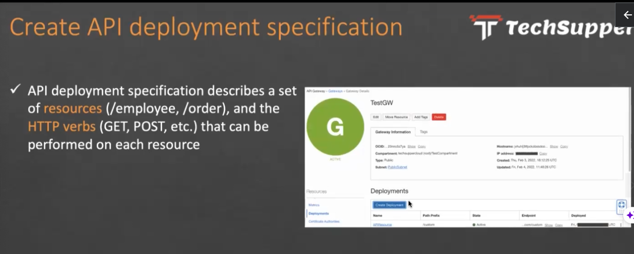 € Create API deployment specification Tr Techsupper API deployment specification describes a set ARG of resources /employee, /order), and the TestGW HTTP verbs (GET, POST, etc.) that can be - performed on each resource Deployments k