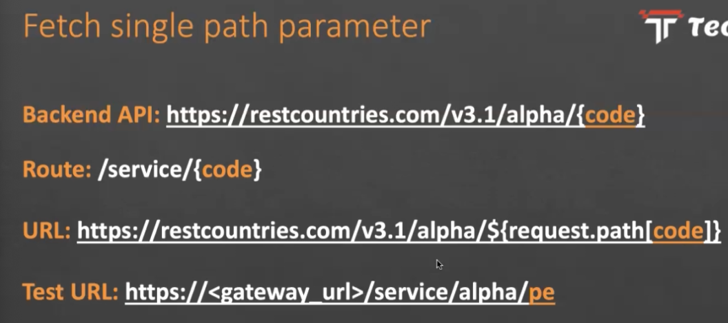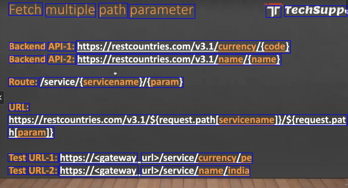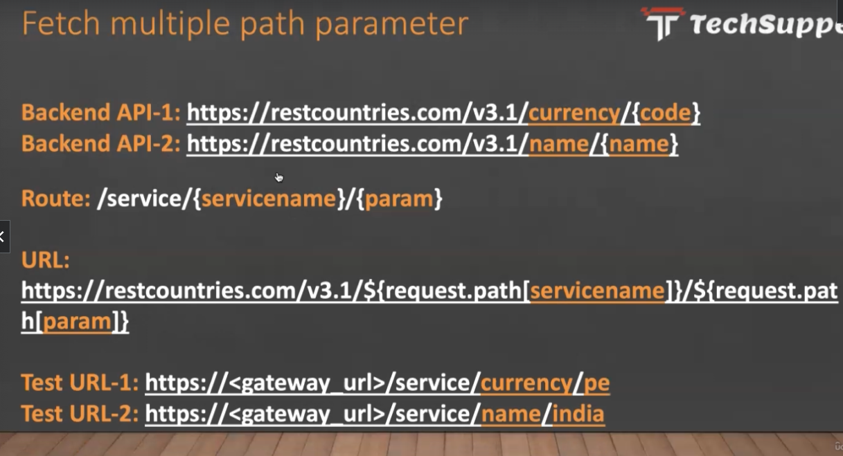 Fetch multiple path parameter Tr Techsupp Backend API-1: htps/estcountries.com/as/eumens/ede) Backend API-2: https://restcountries.com/V8.1/name/iname) Route: /service/(servicenamel/(param) URL: https://restcountries.com/V3.1/Sirequest.pathlservicenamely/S(request.pat h/param]) Test URL-1: https://sgateway urb/service/urrensy/es Test URL-2: https://sgateway. urb/service/name/india