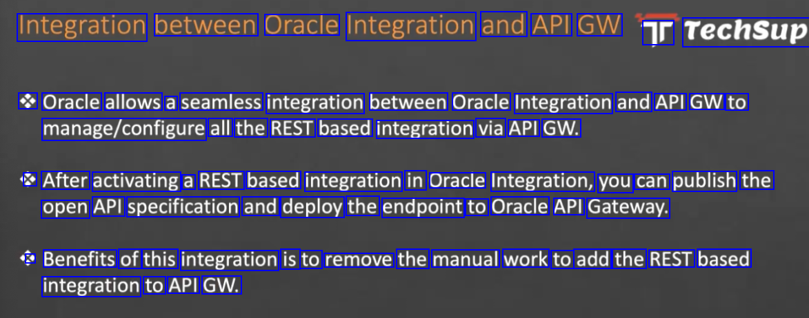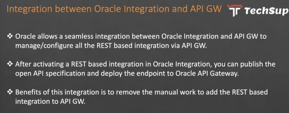 Integration between Oracle Integration and API GW Tr TechSup % Oracle allows a seamless integration between Oracle Integration and API GW to manage/configure all the REST based integration via API GW. % After activating a REST based integration in Oracle Integration, you can publish the open API specification and deploy the endpoint to Oracle API Gateway. C Benefits of this integration is to remove the manual work to add the REST based integration to API GW.