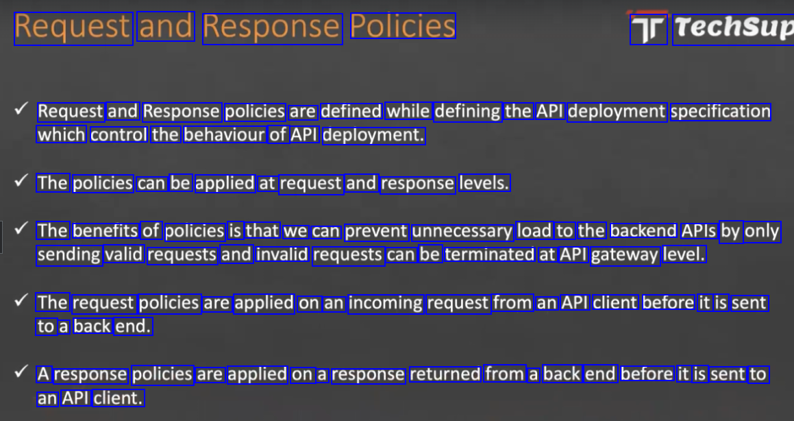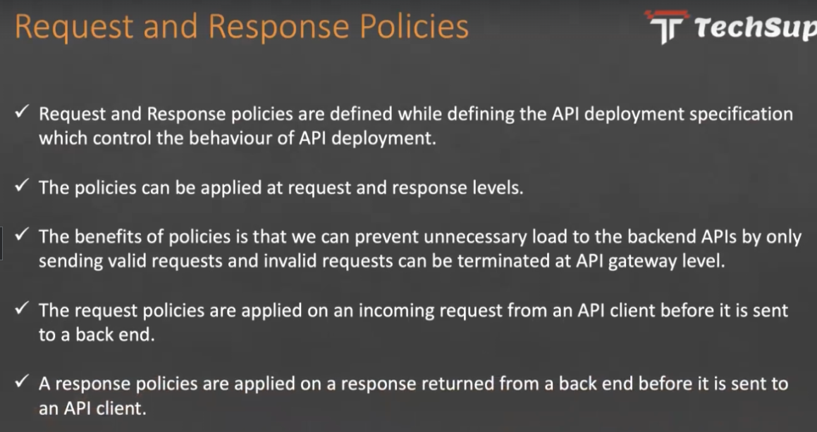 Request and Response Policies Tr Techsup Request and Response policies are defined while defining the API deployment specification which control the behaviour of API deployment. The policies can be applied at request and response levels. The benefits of policies is that we can prevent unnecessary load to the backend APIS by only sending valid requests and invalid requests can be terminated at API gateway level. The request policies are applied on an incoming request from an API client before it is sent to a back end. A response policies are applied on a response returned from a back end before it is sent to an API client.