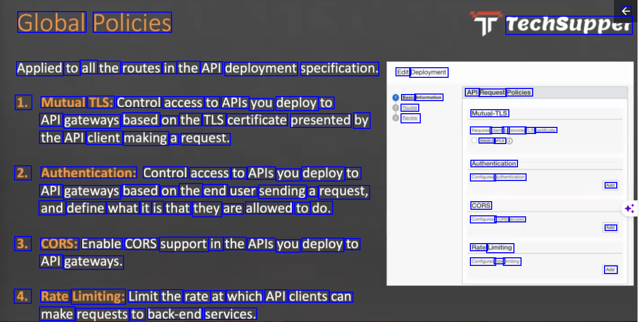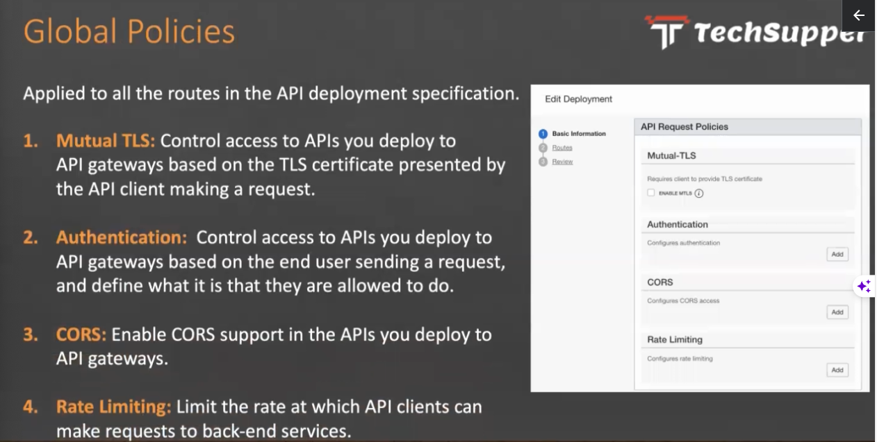 € Global Policies rechsupper Applied to all the routes in the API deployment specification. Edit Deployment Basic Information Boutes Bevisn API Request Policies 1. Mutual TLS: Control access to APIs you deploy to API gateways based on the TLS certificate presented by Mutual-TLS Requires client to provide TLS certificate ENABLE MTLS the API client making a request. Authentication Configures authentication 2. Authentication: Control access to APIs you deploy to API gateways based on the end user sending a request, and define what it is that they are allowed to do. Add CORS Configures CORS access Add 3. CORS: Enable CORS support in the APIs you deploy to Rate Limiting Configures rate limiting API gateways. Add 4. Rate Limiting: Limit the rate at which API clients can make requests to back-end services.