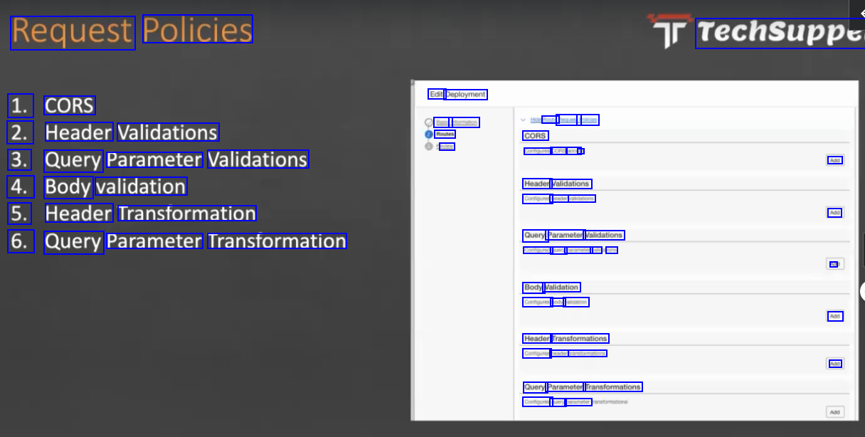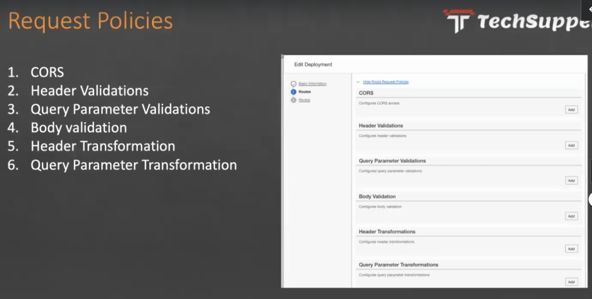 Request Policies Techsuppe Edit Deployment 1. CORS Banc Intormation Routes n Route Requenu Poice CORS Contigures CORS acces - 2. Header Validations 3. Query Parameter Validations Add 4. Body validation Header Validations Configures header valdations 5. Header Transformation Aad Query Parameter Validations Configured query parameter vak ons 6. Query Parameter Transformation a Body Validation Configures body vatiomtion Aad Header Transformations Contigures neader anstomations Add Query Parameter Transformations Confiqures query parameter