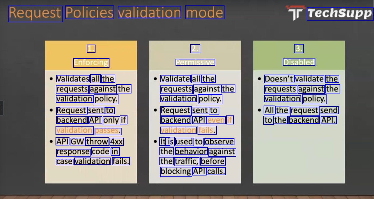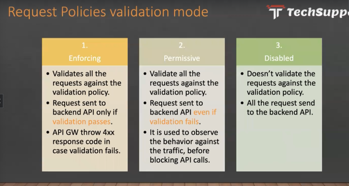 Request Policies validation mode Techsupp 1. 2. 3. Enforcing Permissive Disabled Validates all the requests against the validation policy. Request sent to backend API only if validation passes. API GW throw 4xx response code in case validation fails. Validate all the requests against the validation policy. Request sent to backend API even if validation fails. Doesn't validate the requests against the validation policy. All the request send to the backend API. Iti is used to observe the behavior against the traffic, before blocking API calls.