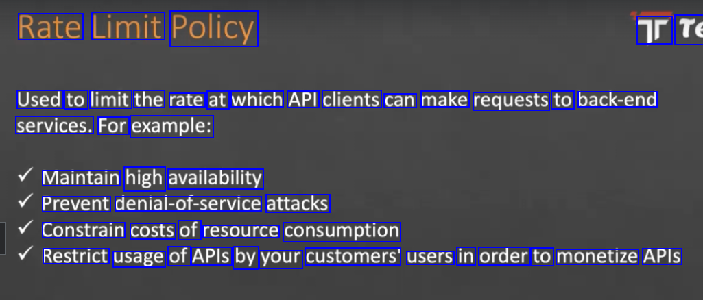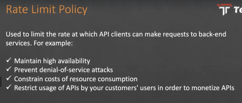 Rate Limit Policy Tr Te Used to limit the rate at which API clients can make requests to back-end services. For example: Maintain high availability Prevent denial-of-service attacks Constrain costs of resource consumption Restrict usage of APIs by your customers' users in order to monetize APIS