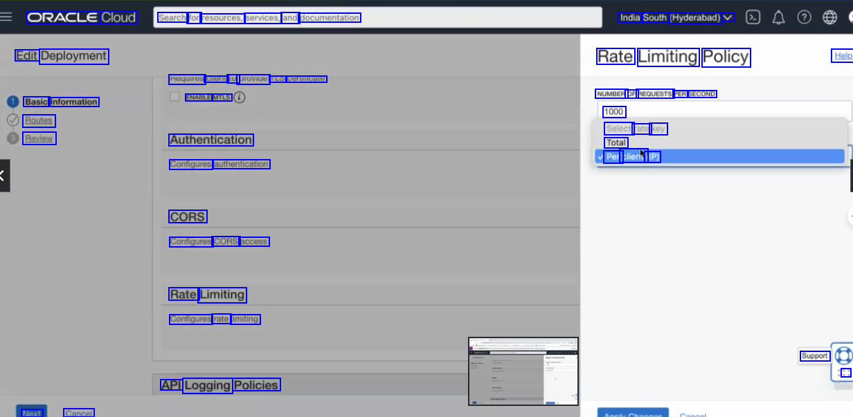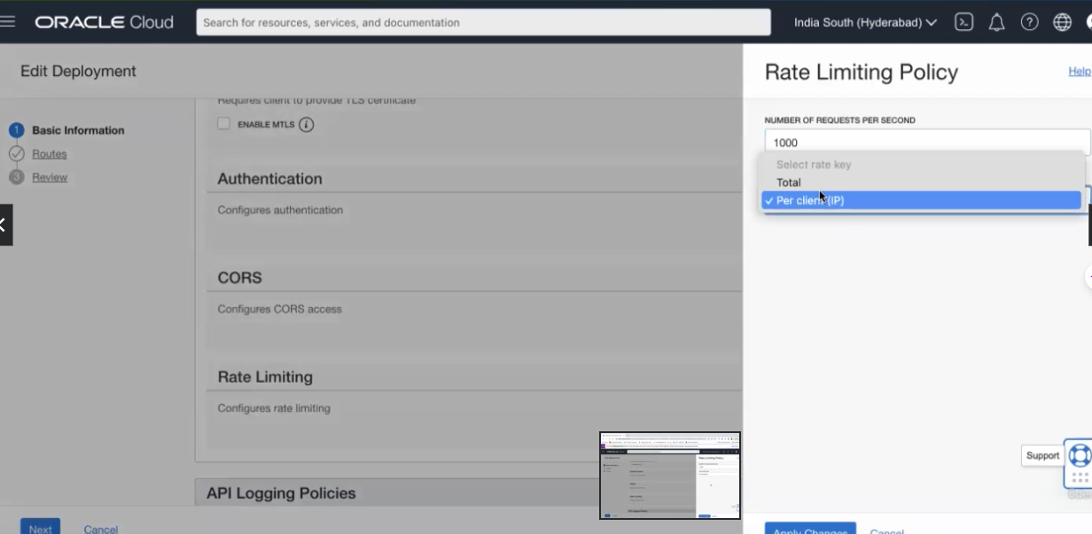 ORACLE Cloud Search for resources, services, and documentation India South (Hyderabad) V Edit Deployment Rate Limiting Policy Help nequires CmeriL LU proviue ILO curuncate ENABLE MTLS NUMBER OF REQUESTS PER SECOND 1000 Select rate key Total Per cliens (IP) Basic Information Routes Review Authentication Configures authentication CORS Configures CORS access Rate Limiting Configures rate limiting Support : API Logging Policies Next Cancel