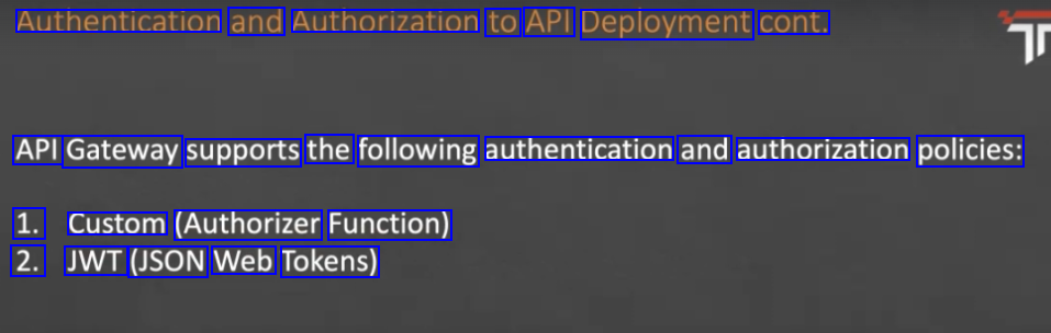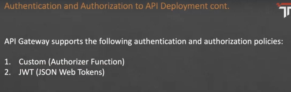 Authentication and Authorization to API Deployment cont. API Gateway supports the following authentication and authorization policies: 1. Custom (Authorizer Function) 2. JWT (JSON Web Tokens)
