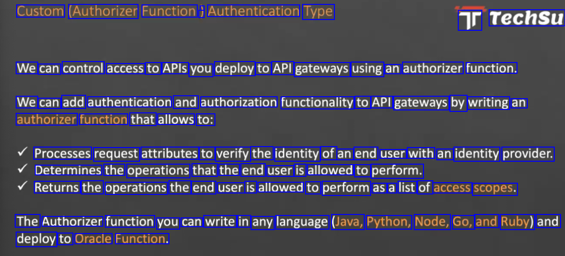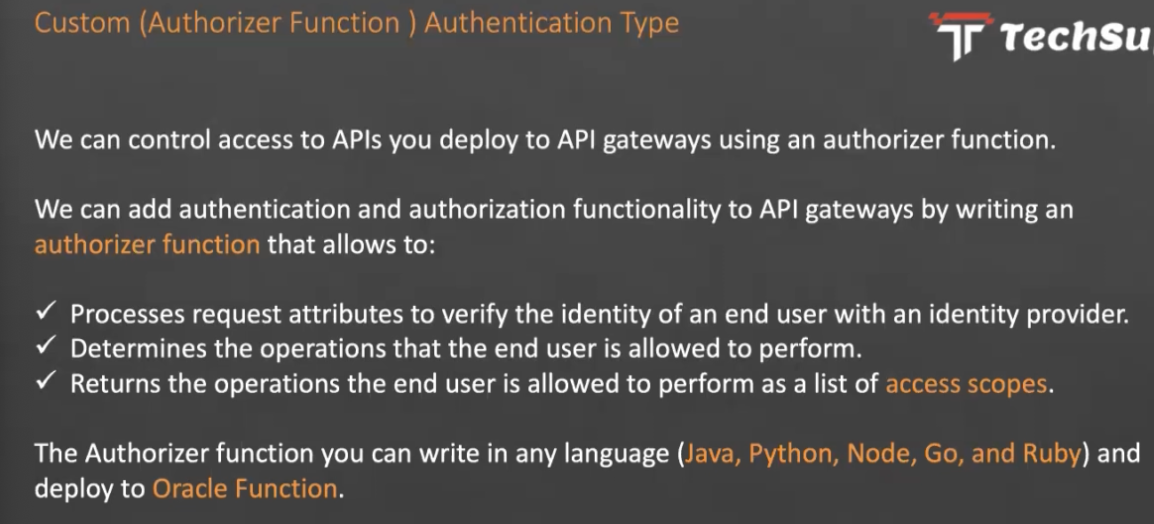 Custom (Authorizer Function ) 1 Authentication Type Tr Techsu We can control access to APIS you deploy to API gateways using an authorizer function. We can add authentication and authorization functionality to API gateways by writing an authorizer function that allows to: Processes request attributes to verify the identity of an end user with an identity provider. Determines the operations that the end user is allowed to perform. Returns the operations the end user is allowed to perform as a list of access scopes. The Authorizer function you can write in any language (Java, Python, Node, Go, and Ruby) and deploy to Oracle Function.