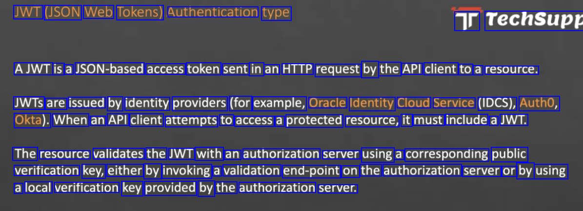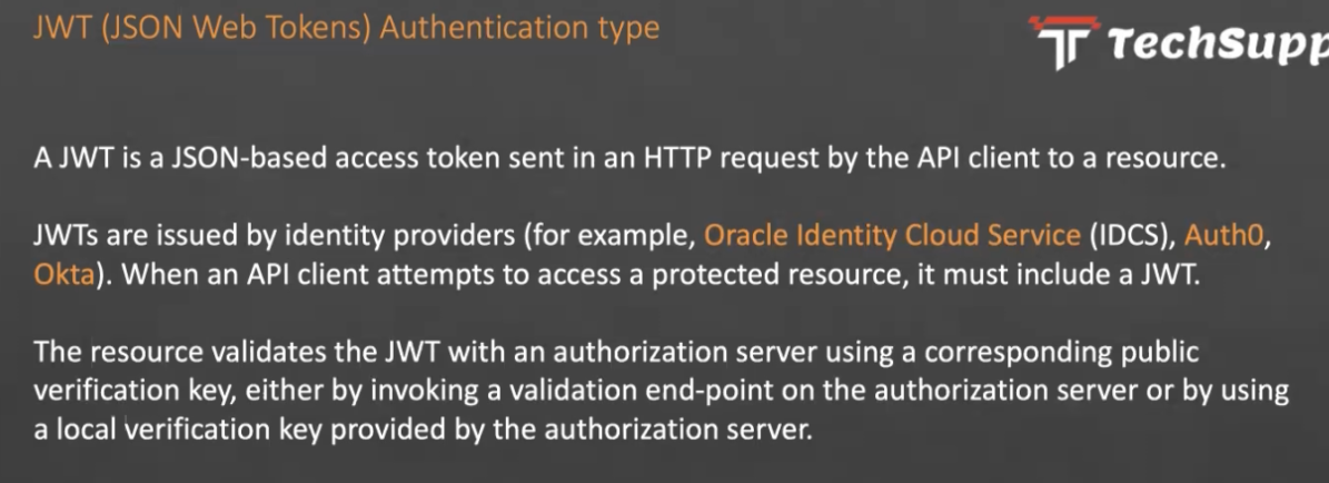 JWT (JSON Web Tokens) Authentication type Tr Techsupp AJWT is a JSON-based access token sent in an HTTP request by the API client to a resource. JWTS are issued by identity providers (for example, Oracle Identity Cloud Service (IDCS), Auth0, Okta). When an API client attempts to access a protected resource, it must include a JWT. The resource validates the JWT with an authorization server using a corresponding public verification key, either by invoking a validation end-point on the authorization server or by using a local verification key provided by the authorization server.