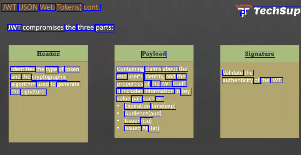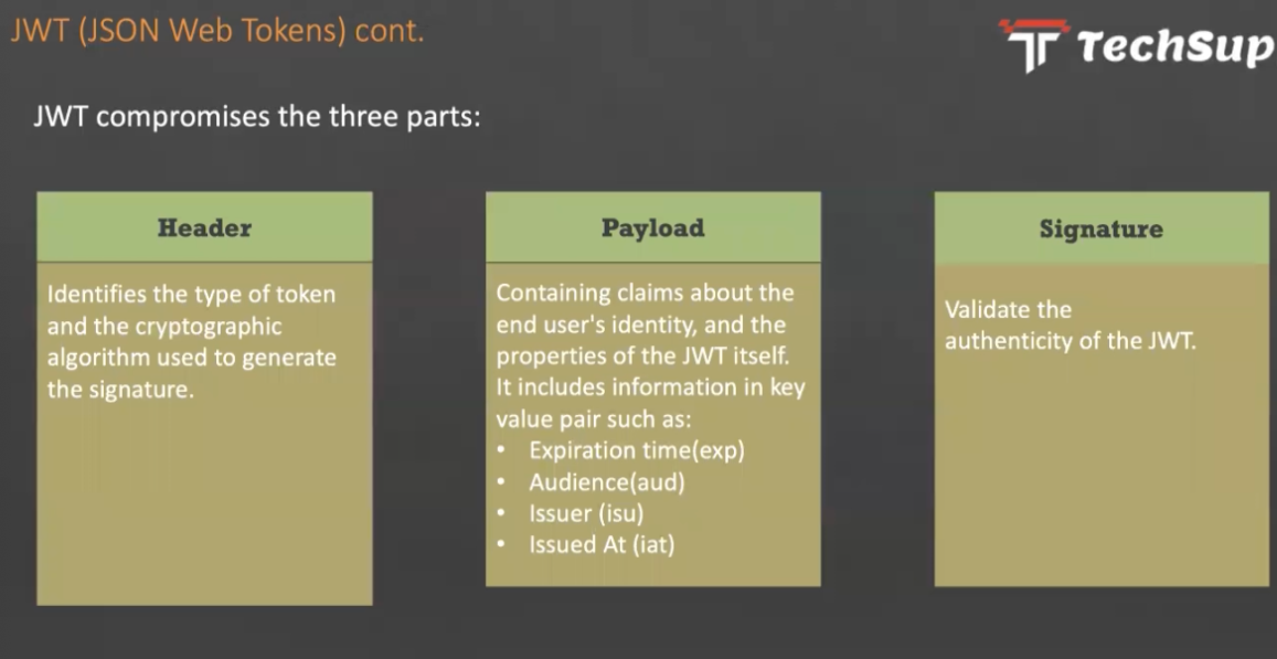 JWT (JSON Web Tokens) cont. D - - TechSup JWT compromises the three parts: Header Payload Signature Identifies the type of token and the cryptographic algorithm used to generate the signature. Containing claims about the end user's identity, and the properties of the JWT itself. Iti includes information in key value pair such as: Expiration time(exp) Audience(aud) Issuer (isu) Issued At (iat) Validate the authenticity of the JWT.