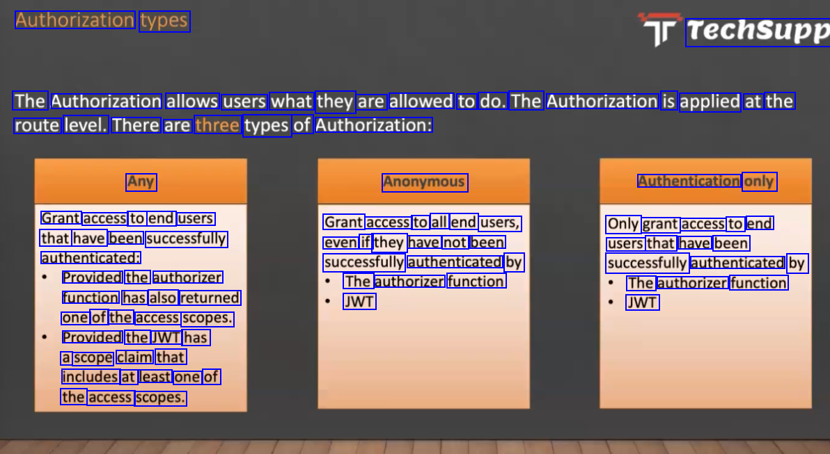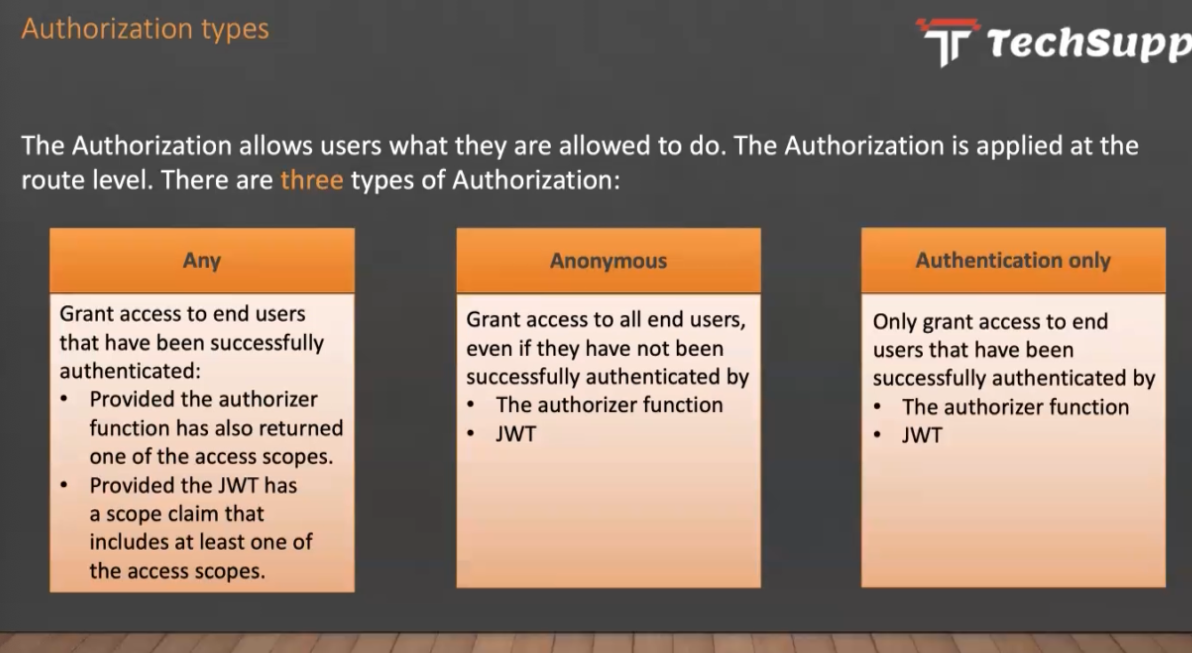 Authorization types Techsupp The Authorization allows users what they are allowed to do. The Authorization is applied at the route level. There are three types of Authorization: Any Anonymous Authentication only Grant access to end users that have been successfully authenticated: Grant access to all end users, even if they have not been successfully authenticated by The authorizer function Only grant access to end users that have been successfully authenticated by The authorizer function Provided the authorizer function has also returned one of the access scopes. Provided the JWT has a scope claim that includes at least one of the access scopes. JWT JWT