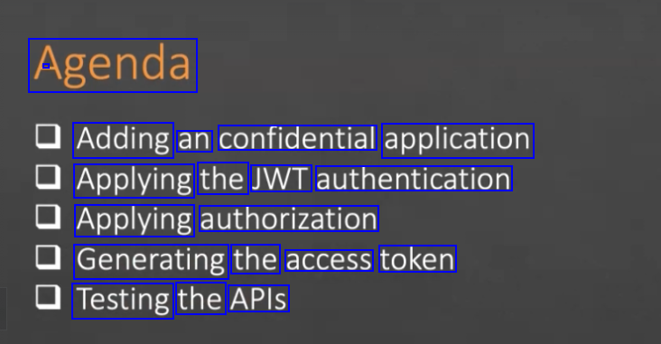 Agenda Adding an confidential application Applying the JWT authentication Applying authorization Generating the access token Testing the APIs