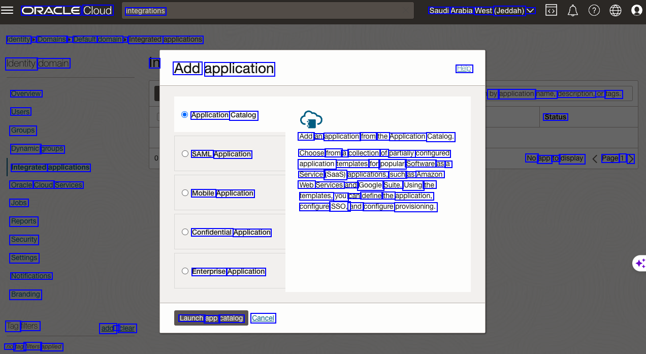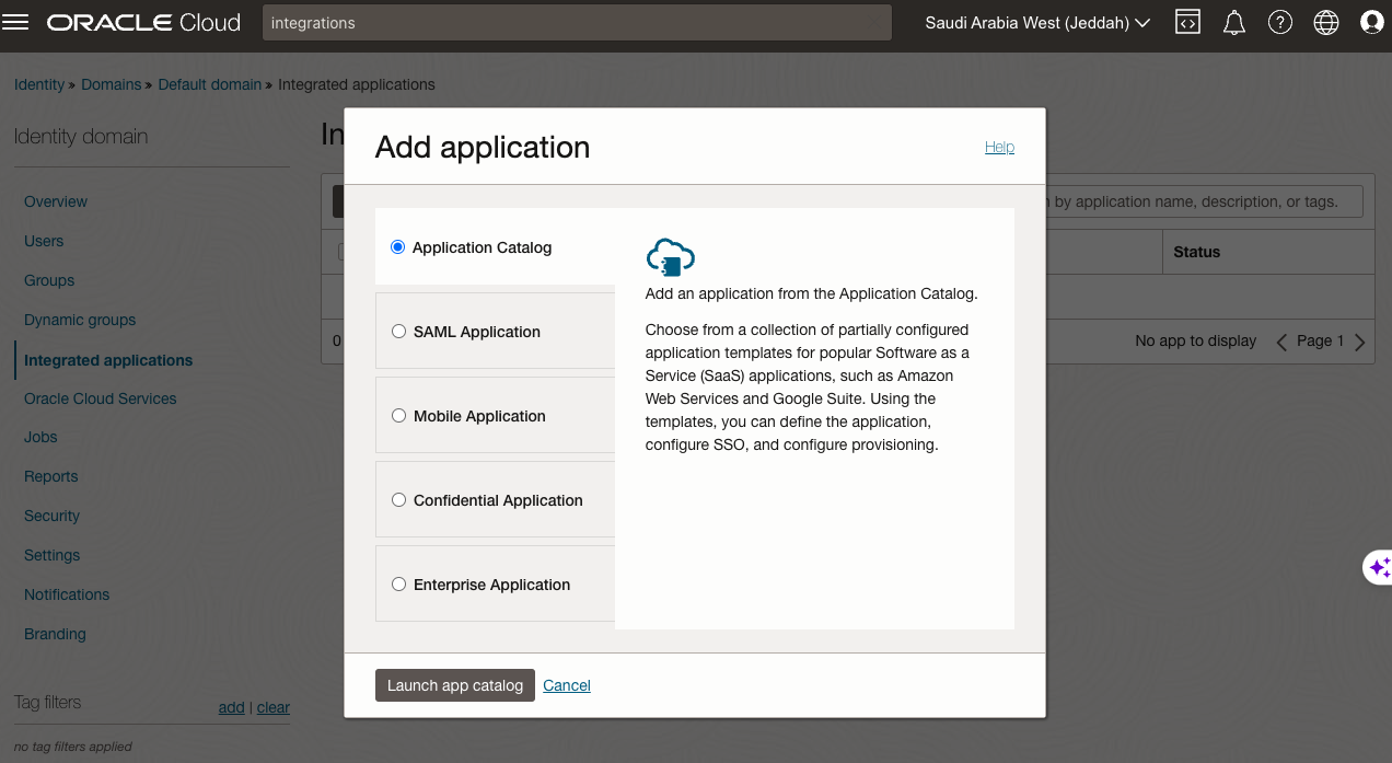 ORACLE Cloud integrations Saudi Arabia West (Jeddah) V Identity > Domains: > Default domain e Integrated applications Identity domain In Add application Help Overview Users Groups Dynamic groups Integrated applications Oracle Cloud Services Jobs Reports Security Settings Notifications Branding by application name, description, or tags. Application Catalog Status Add an application from the Application Catalog. Choose from a collection of partially configured application templates for popular Software as a Service (Saas) applications, such as Amazon Web Services and Google Suite. Using the templates, you can define the application, configure SSO, and configure provisioning. SAML Application No app to display Page 1 > Mobile Application Confidential Application Enterprise Application Launch app catalog Cancel Tag filters add - clear no tag filters applied